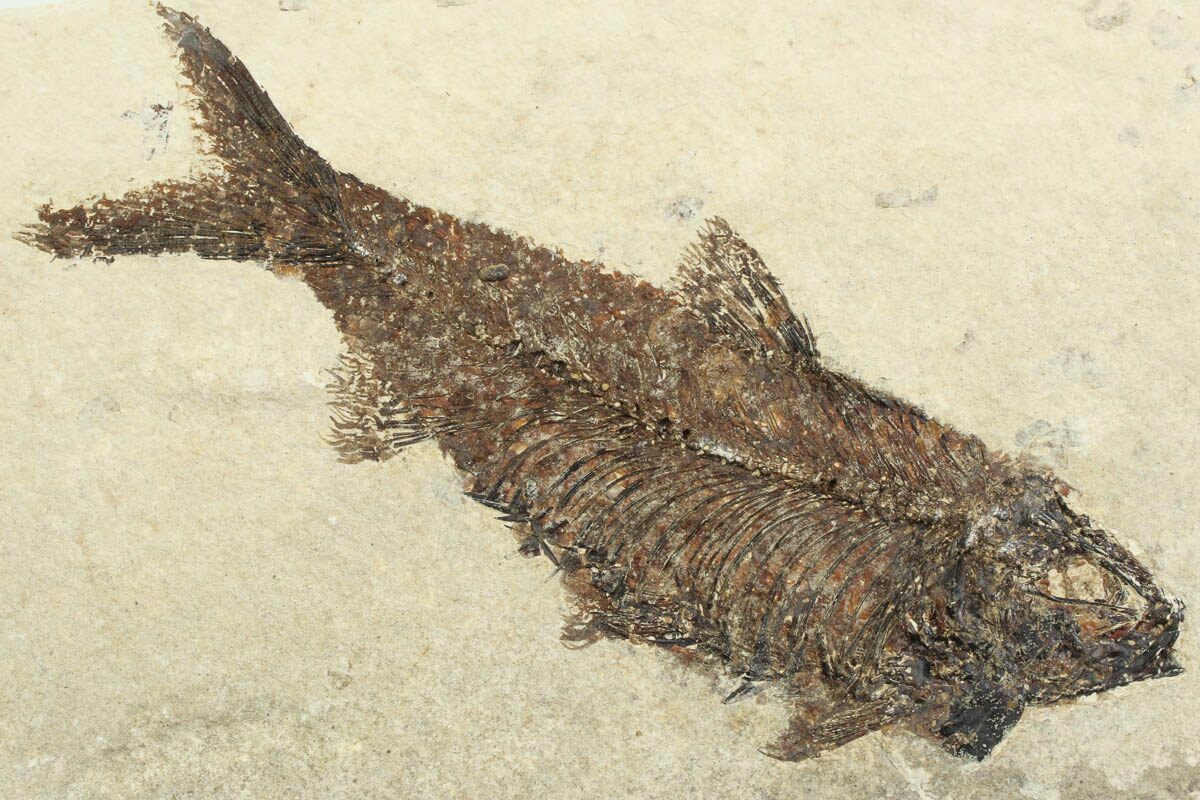 This 5.7" long Knightia eocaena fossil fish comes from the Eocene-aged Green River Formation of Wyoming. It is well-preserved and expertly prepared, with bone structure, fins, and scale texture clearly visible.