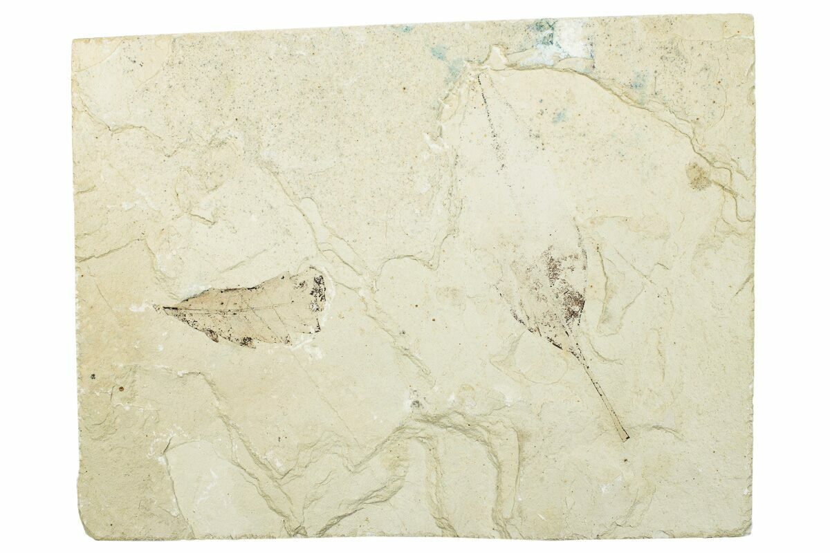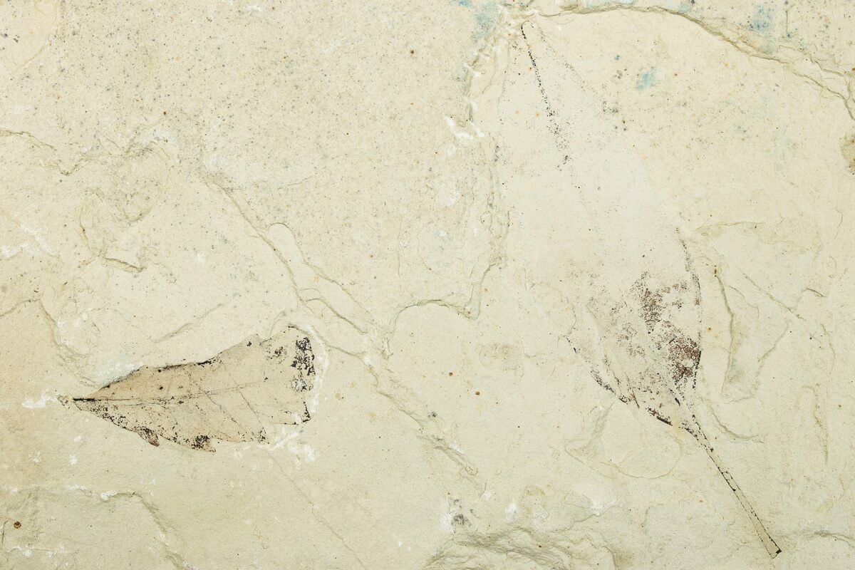 This is an interesting fossil leaf plate from the Green River Formation, Utah. It contains light-colored leaves: a larger (2.8" including stem) leaf fragment possibly of the genus Platycarya, and a smaller one (1.25"), possibly of the genus Rhus.