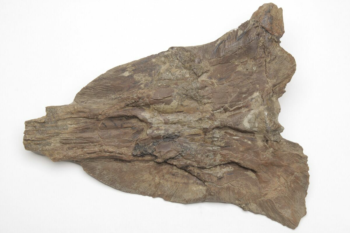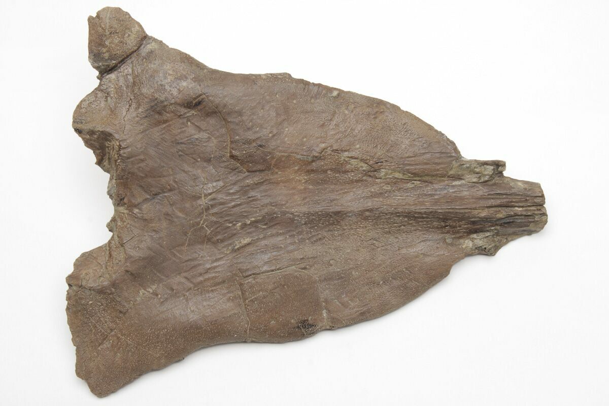 This is a 5.7" long, section of skull bone from a Mosasaur (Platecarpus sp.) found in the Late Cretaceous, Smoky Hill Chalk of Gove County, Kansas. This bone was situated at the top, rear of the mosasaur's skull, near where the spine connects to the head. It sat above the parietal and included the frontal bones about midway on the skull. The bone preservation of this piece is awesome and many of the suture lines are very visible. There is an average amount of restoration on the bone given the extraction process from the rock.