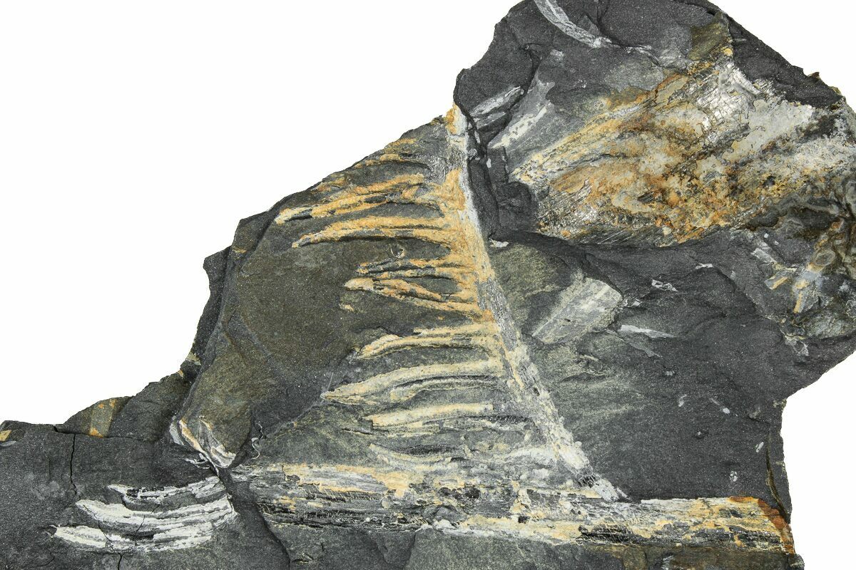 These plants were buried in a swamp where a low temperature, low pressure, and low oxygen environment caused the plant tissue to be slowly replaced by pyrite. This pyrite was later replaced by a whitish mineral (aluminum silicate) as the fossils were buried and exposed to the heat and pressure inside of the earth. The majority of the ferns on this plate are of the genus Alethopteris, though Pecopteris ferns can be seen from time to time.