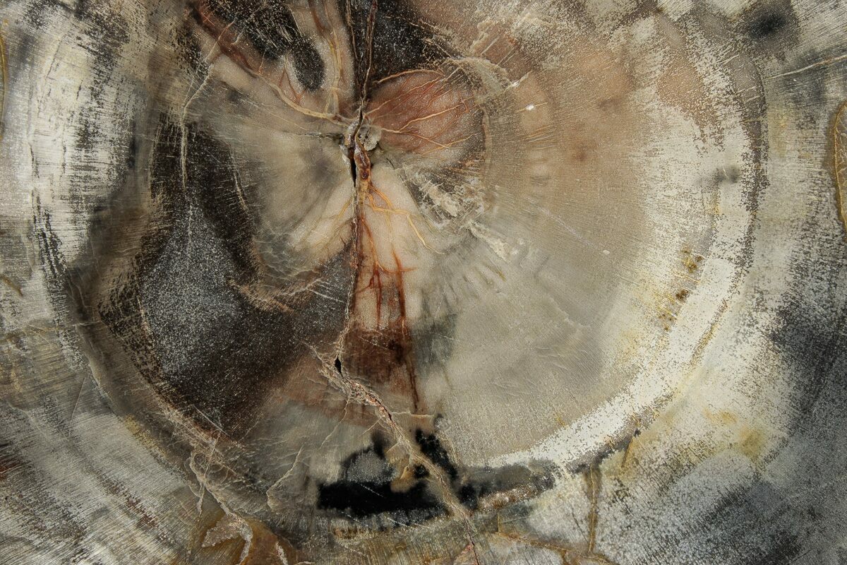 This is a 5.7" wide round of petrified wood (Araucaria) from Ambilobe, Madagascar. Araucaria is a coniferous tree in the family that includes the modern Monkey Puzzle tree. This 220 million year old petrified wood has been sliced and polished on both sides, allowing the stunning inner wood detail and fantastic coloration to easily be seen.
