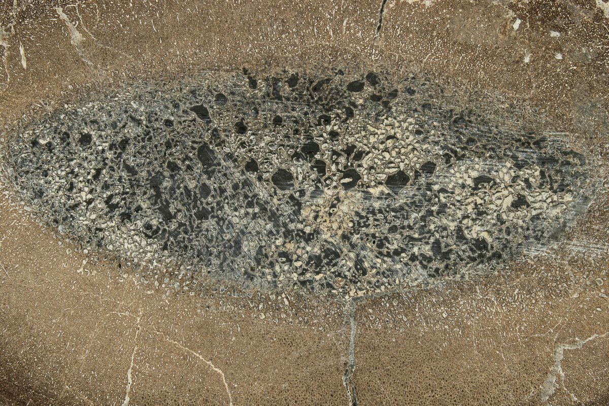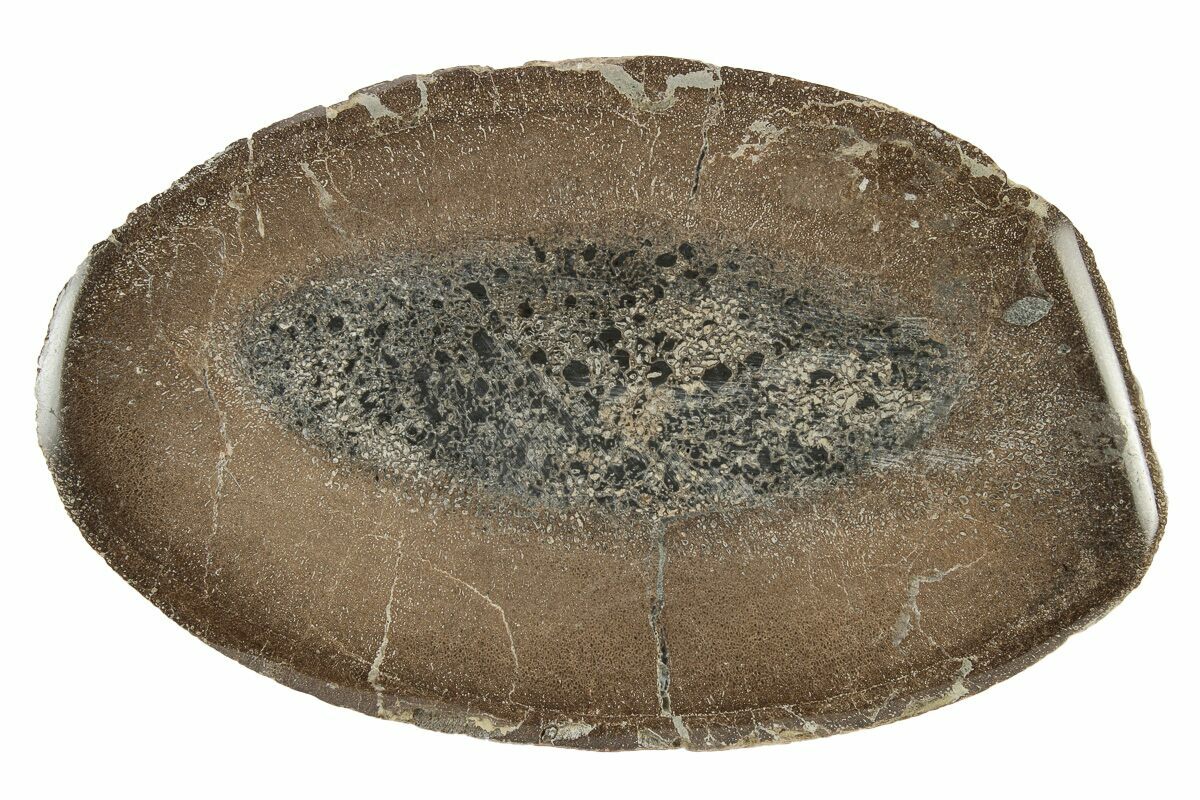 This is a 5.7" wide slice of polished limb bone from the pliosaur, Stretosaurus (Pliosaurus) cf. macromerus. The bone comes from Abingdon, England. It is Upper Jurassic (Kemmeridgian stage) in age, or approximately 155 million years old. It has been cut and polished on one side to reveal the beautifully preserved cell structure.