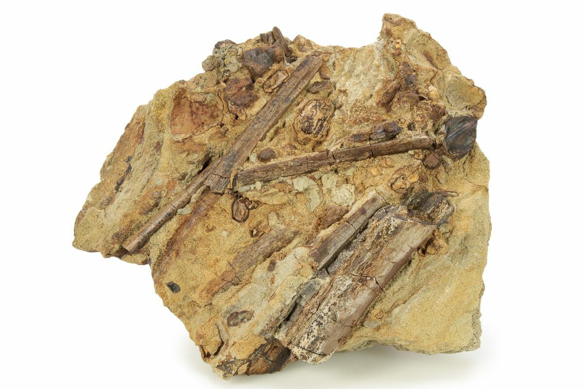 This 5.7" wide piece of sandstone contains several hadrosaur (Edmontosaurus annectens) ossified tendons, partial bones, and a beautiful unworn Triceratops horridus tooth. It was collected from the Lance (Creek) Formation of Wyoming.