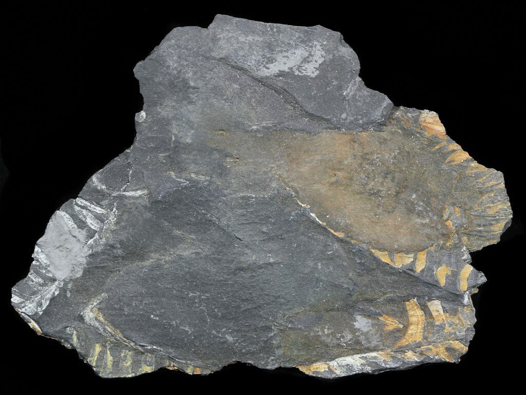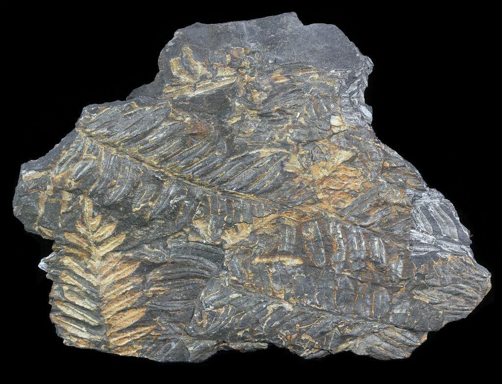 This is a plate of seed fern fossils from the Pennsylvanian aged (305 million year) Llewellyn formation of Pennsylvania. The white color of these detailed fern fossils contrasts well against the black shale they are preserved in. These plants were buried in a swamp where a low temperature, pressure, and oxygen environment the plant tissue was slowly replaced by pyrite. This pyrite was later replaced by a whitish mineral (aluminum silicate) as the fossils were buried and exposed to the heat and pressure inside of the earth. There are several types of seed ferns (which look very similar) on these plates including Alethopteris and Neuropteris.