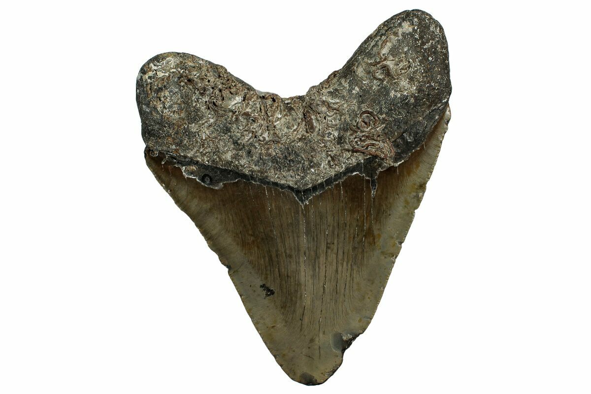 The standard measure for megalodon teeth is slant height, or the longest edge of the tooth. Adult megalodon teeth were typically in the 4 to 5 inch range: teeth over 6 inches are rare and represent super-sized individuals. Only a handful of teeth have ever been found over seven inches.