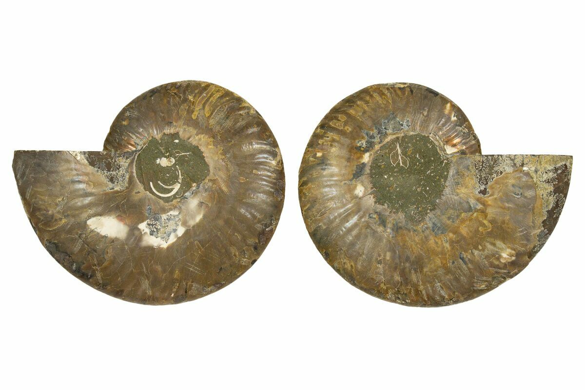 Both halves are included along with a pair of display stands. The center of the ammonite is a composite from another specimen.