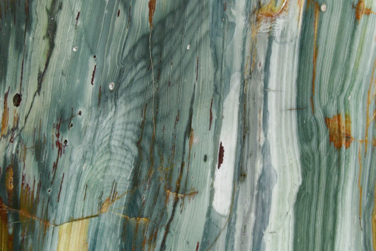 Gary Green Jasper, also referred to as petrified bog wood or Larsonite, is a form of petrified wood from a location near McDermitt, Oregon on the Nevada/Oregon border. It is believed to be wood covered by volcanic activity between 11-15 million years ago. The volcanic event covered this area in debris that deprived the plants of oxygen, halting the decay process. Minerals from the volcanic ash then acted as the replacement material for this petrification/mineralization, giving the wood these vibrant colors.