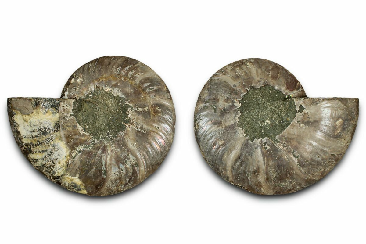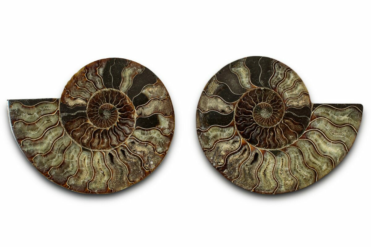 Both halves are included along with a pair of display stands. The center of the ammonite is a composite from another specimen.