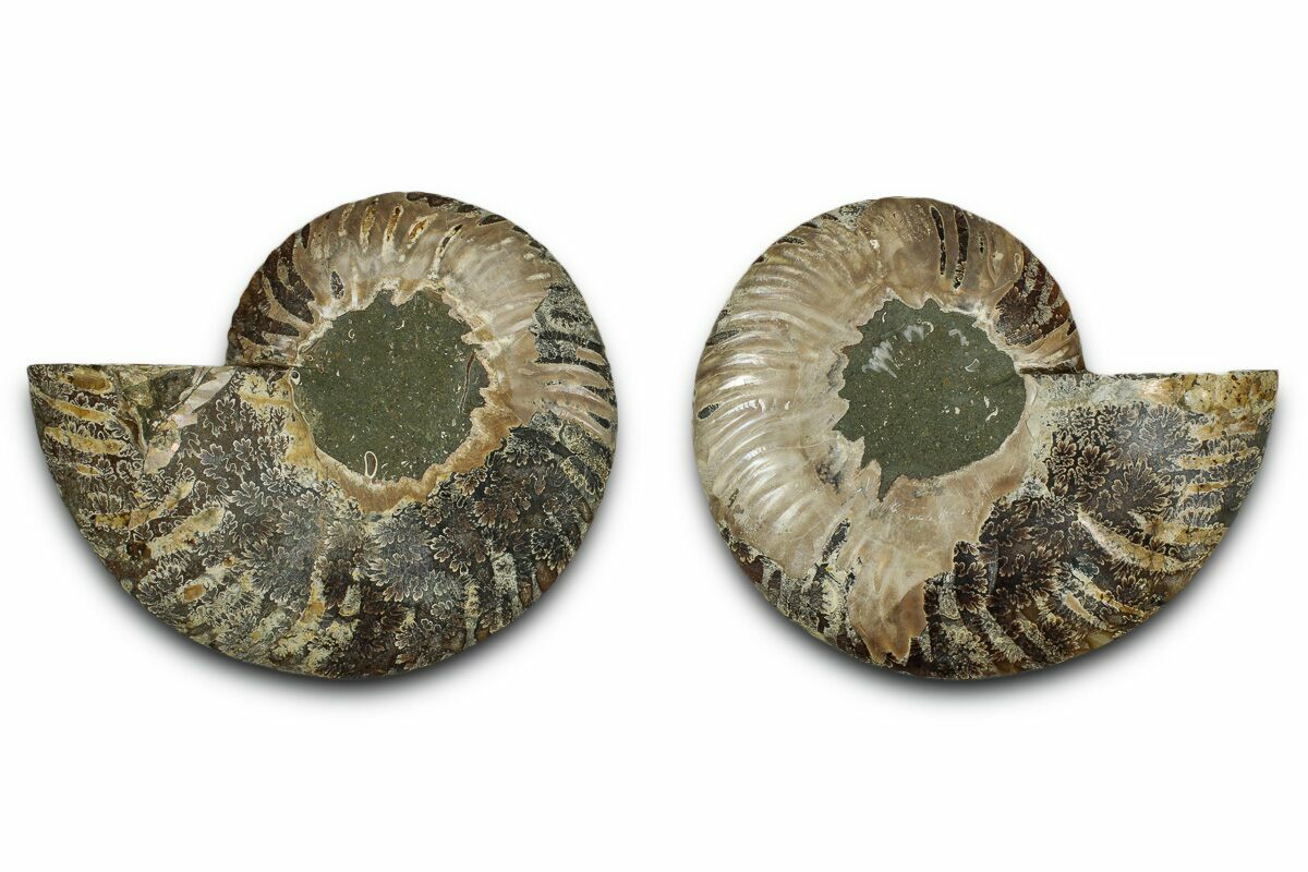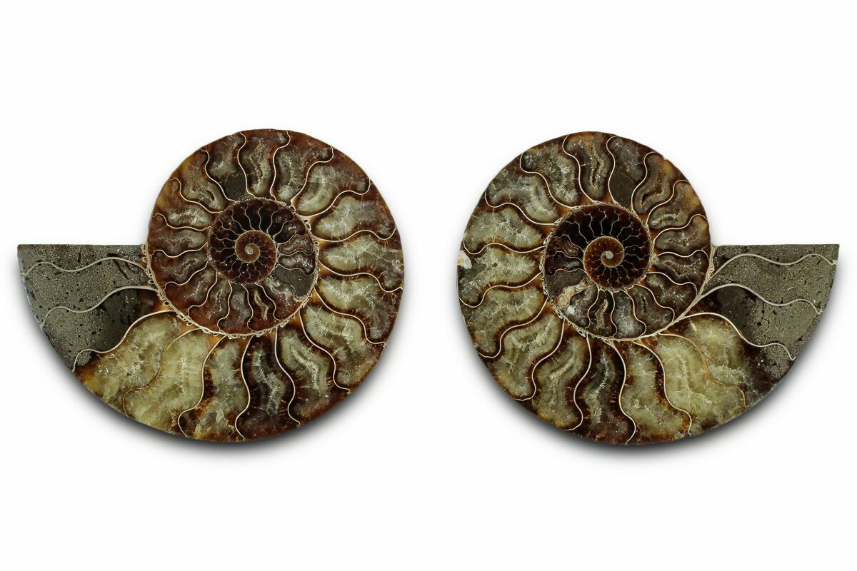 Both halves are included along with a pair of display stands. The center of the ammonite is a composite from another specimen.