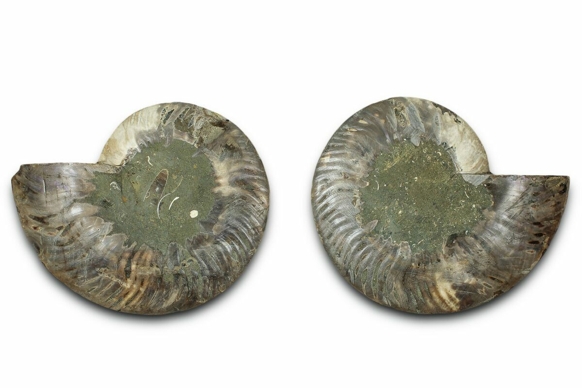 Both halves are included along with a pair of display stands. The center of the ammonite is a composite from another specimen.