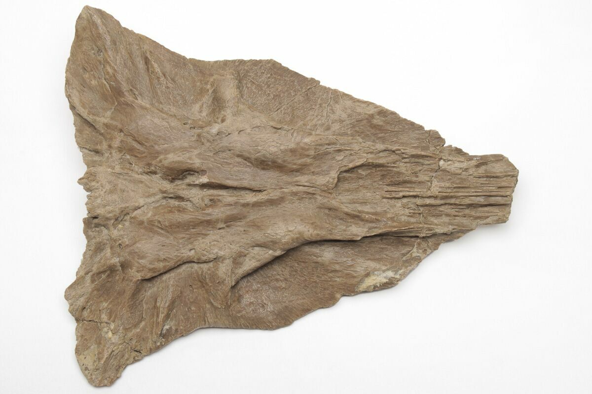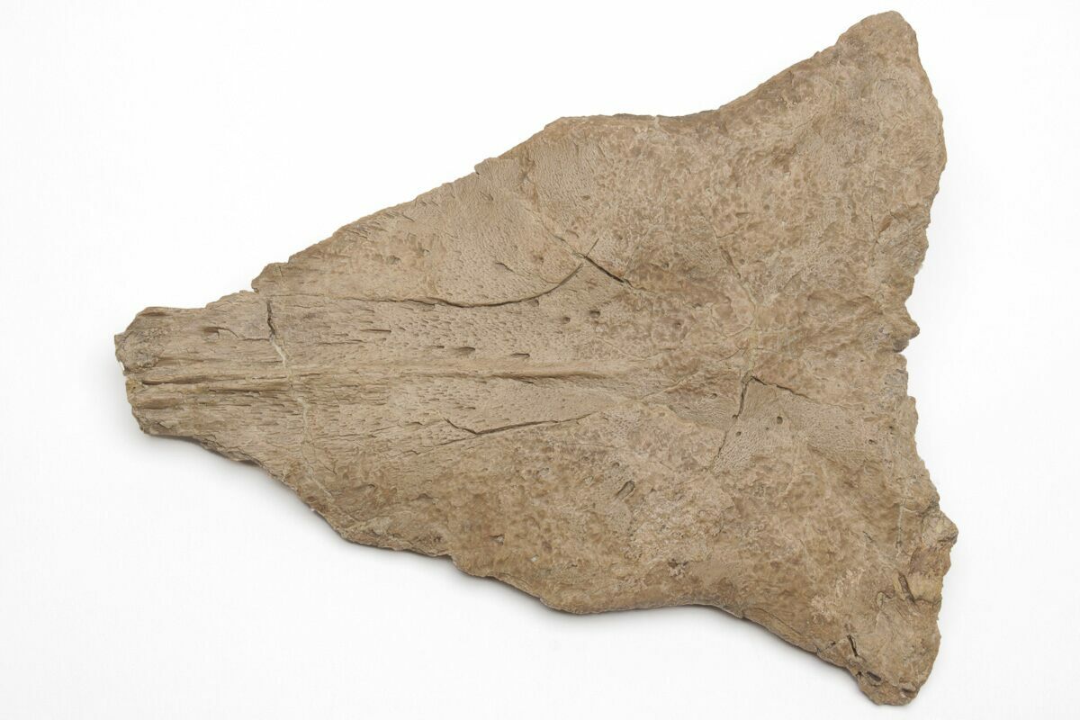This is a 5.8" long, section of skull bone from a Mosasaur (Platecarpus sp.) found in the Late Cretaceous, Smoky Hill Chalk of Gove County, Kansas. This bone was situated at the top, rear of the mosasaur's skull, near where the spine connects to the head. It sat above the parietal and included the frontal bones about midway on the skull. The bone preservation of this piece is awesome and many of the suture lines are very visible. There is an average amount of restoration on the bone given the extraction process from the rock.