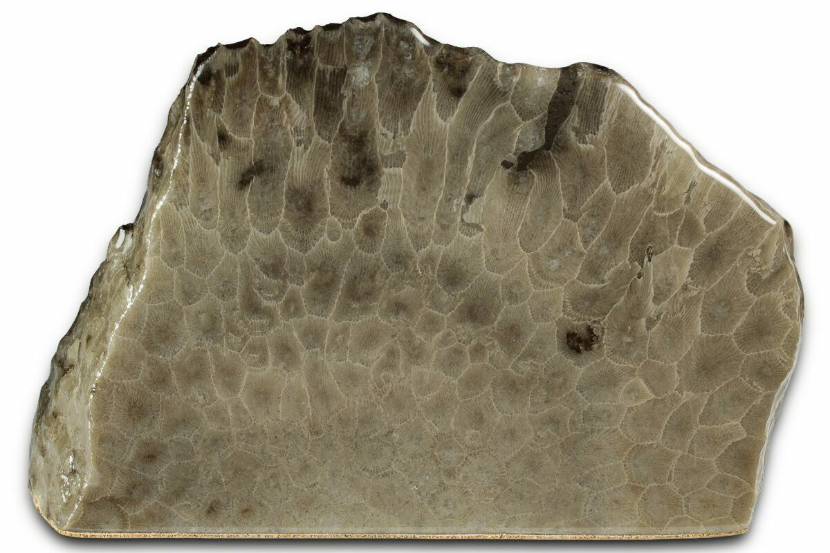 Known locally as Petoskey stones, this fossil coral is commonly found along the shores of Lake Michigan and Lake Huron, as well as in rock quarries stretching from Alpena to Traverse City, Michigan. The material comes from Hexagonaria percarinata, a species of rugose coral that lived during the Middle Devonian, roughly 350 million years ago. Petoskey stones are officially designated as the state stone of Michigan.