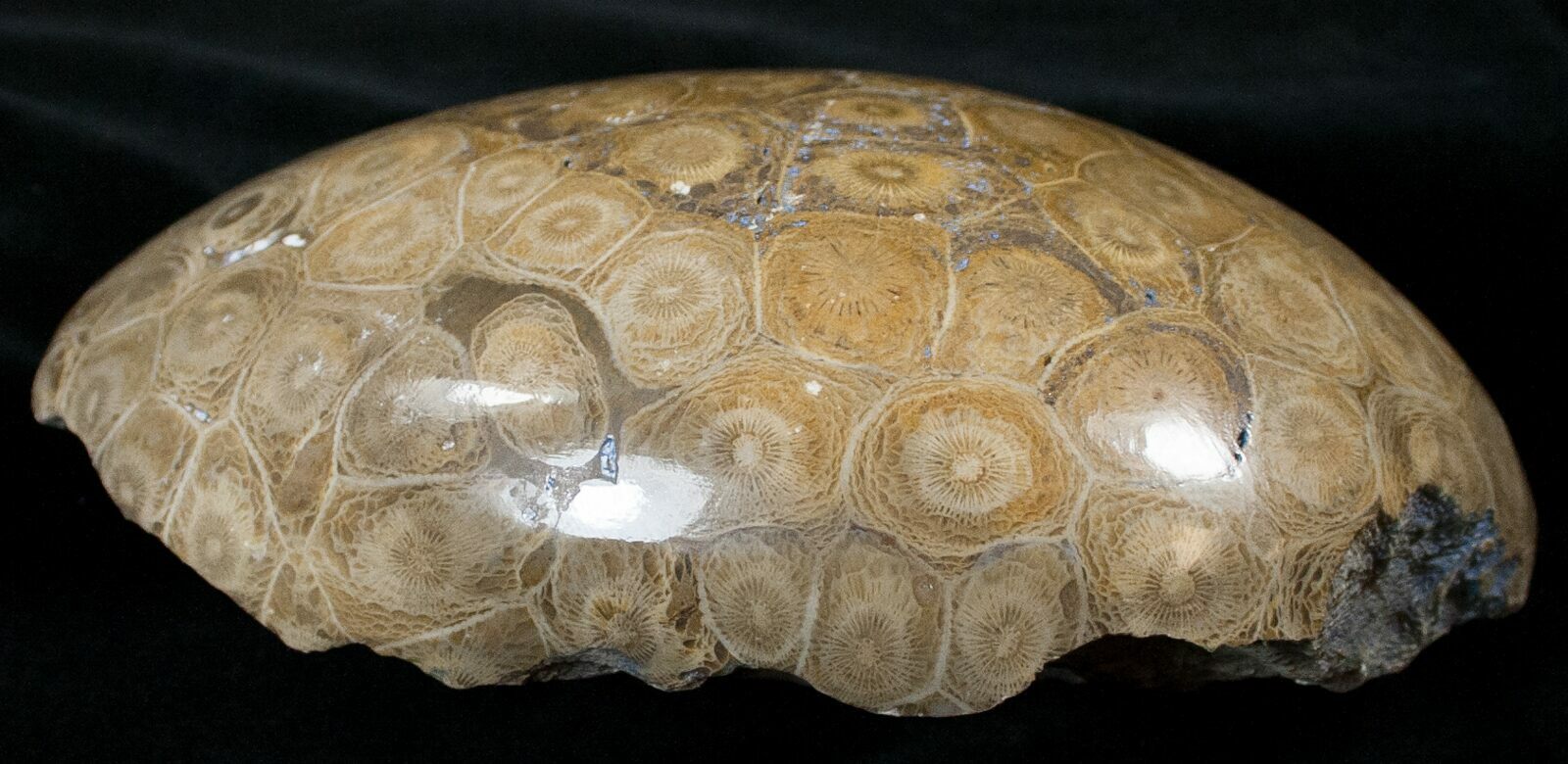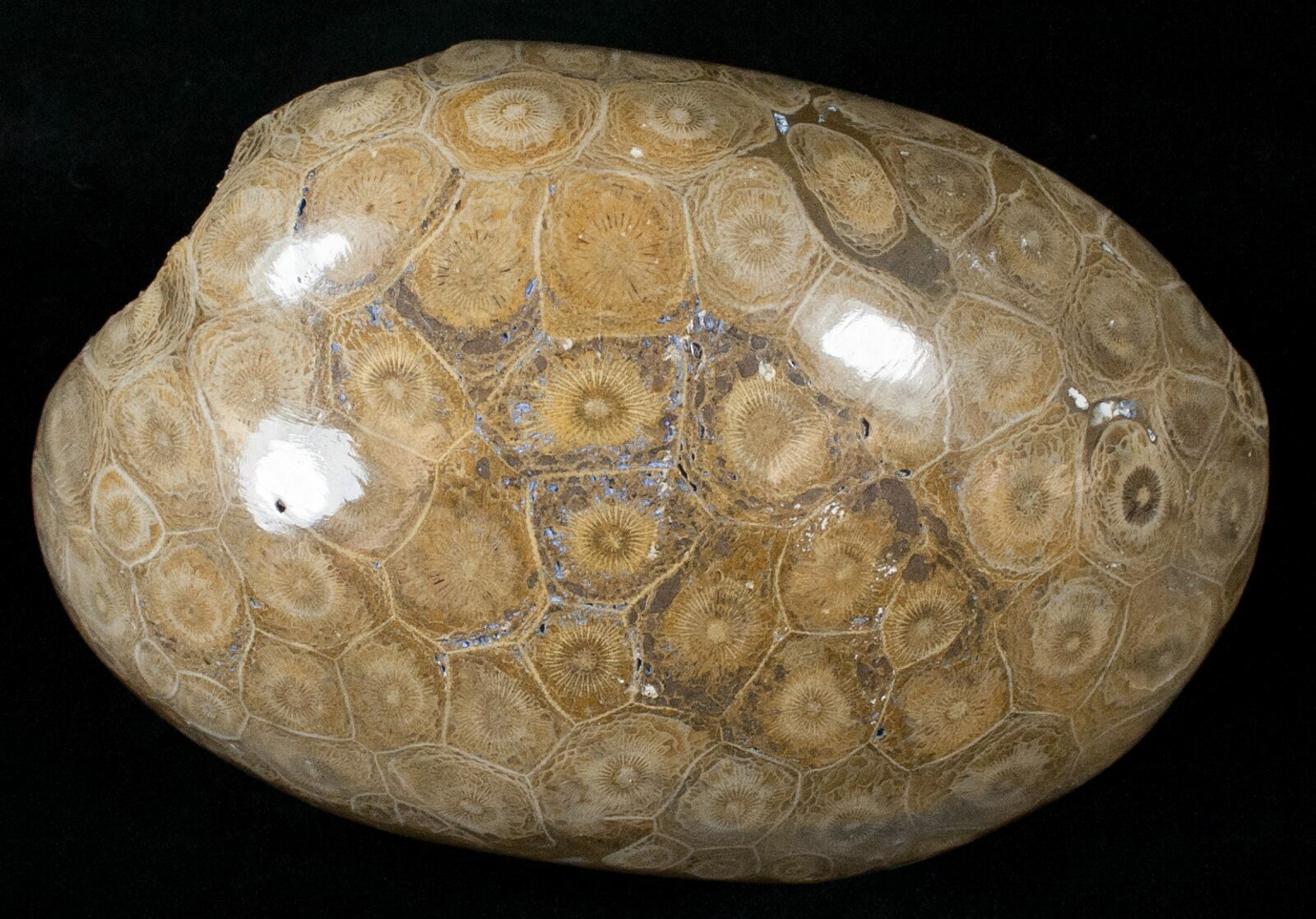 This is a beautiful piece of fossil coral collected near Assa Zag, Morocco in the Western Sahara. It is Early Pennsylvanian in age, or approximately 320 million years old. The polishing shows off the beautiful inner structure of the coral colony beautifully. It looks very similar to the fossil coral "Petoskey stones" found in Michigan, though these are a different genus of coral.