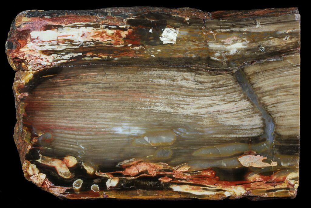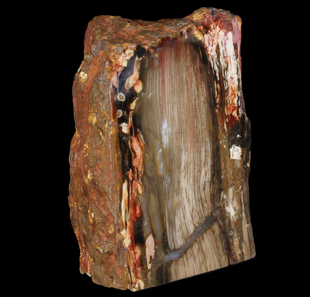 This is a 5.8" tall, polished section of petrified wood from Australia, known as "Peanut Wood". It gets it's name due to the fact, it is actually petrified driftwood that is full of boreholes from clam larvae in the genus Teredo commonly know as shipworms. These boreholes were filled in by a white mineral during the fossilization process, giving this petrified wood it's unique appearance. The wood itself is from Aruacaria, a type of conifer, and is Cretaceous in age.