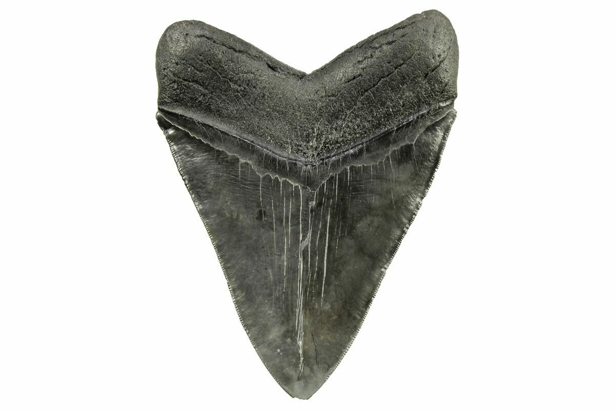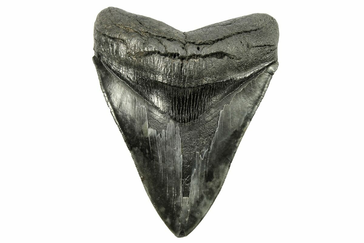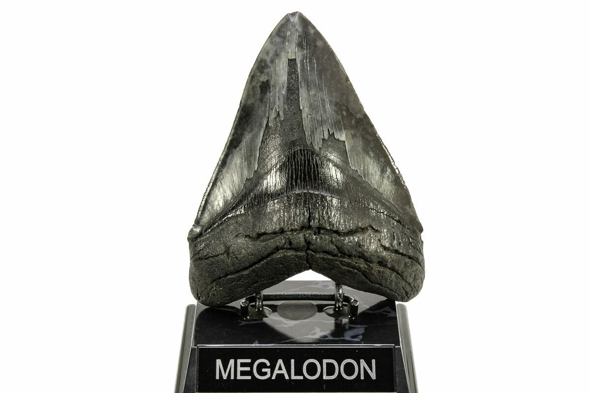 The standard measure for megalodon teeth is slant height, or the longest edge of the tooth. Adult megalodon teeth were typically in the 4 to 5 inch range: teeth over 6 inches are rare and represent super-sized individuals. Only a handful of teeth have ever been found over seven inches.