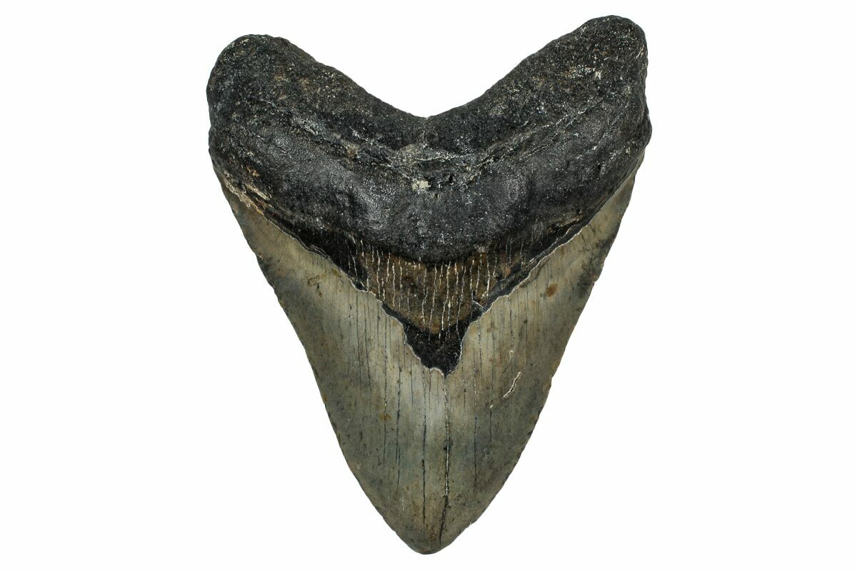 The standard measure for megalodon teeth is slant height, or the longest edge of the tooth. Adult megalodon teeth were typically in the 4 to 5 inch range: teeth over 6 inches are rare and represent super-sized individuals. Only a handful of teeth have ever been found over seven inches.