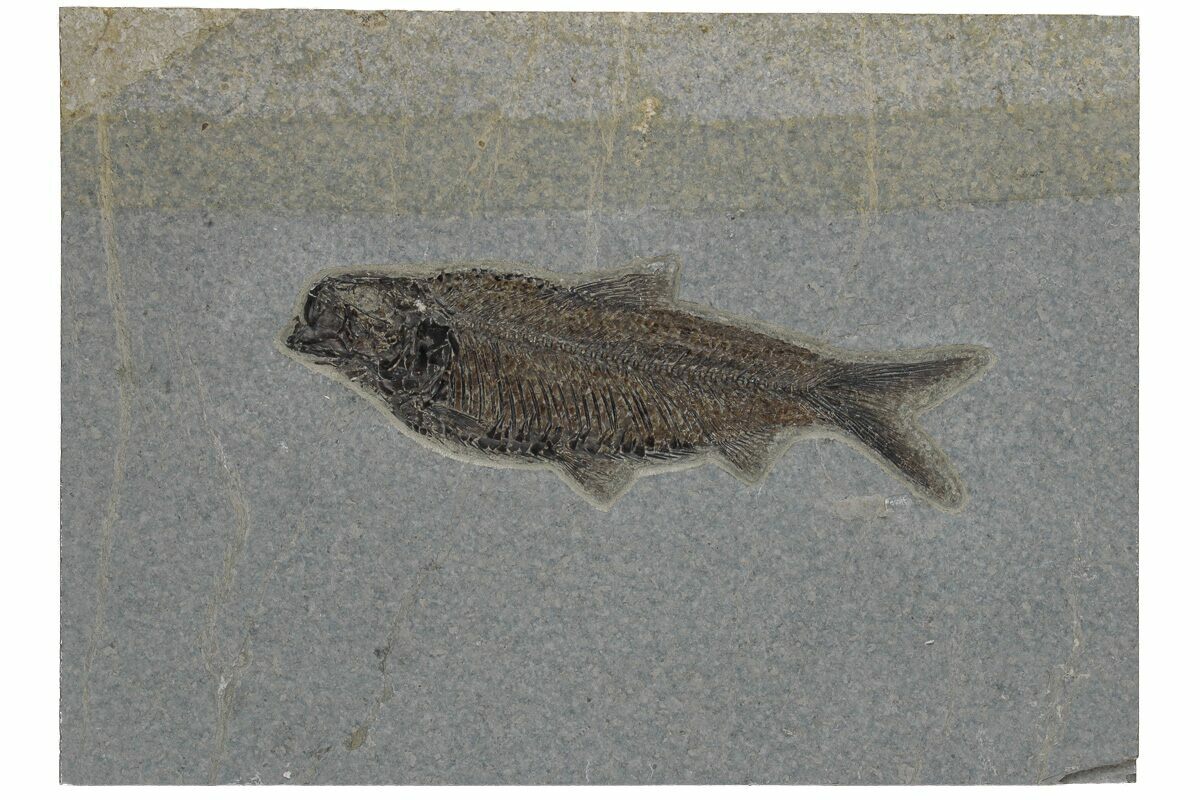 This 5.85" long fossil fish (Knightia eocaena) from the Eocene-age Green River Formation of Wyoming. It is nicely detailed and prepared with bone structure, fins, and overlapping scale structure visible. It's nicely centered on a rectangular slab of grey shale.