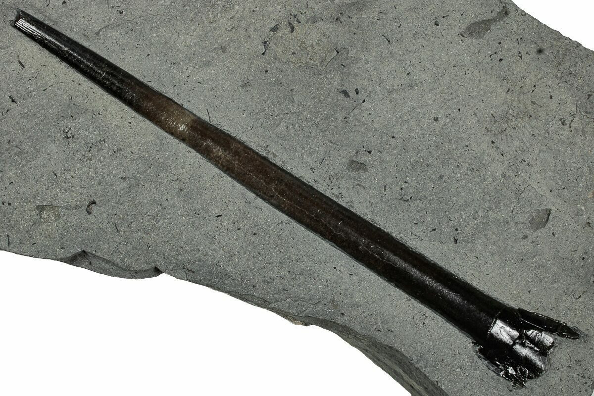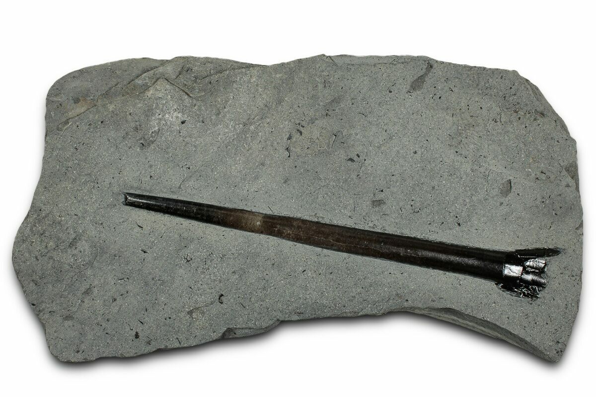This is a 5.85" long fossil belemnite (Acrocoelites sp.) rostrum from the Jurassic-aged Posidonia Shale of Holzmaden, Germany. The belemnite fossil has been exposed from the rock it was found in.