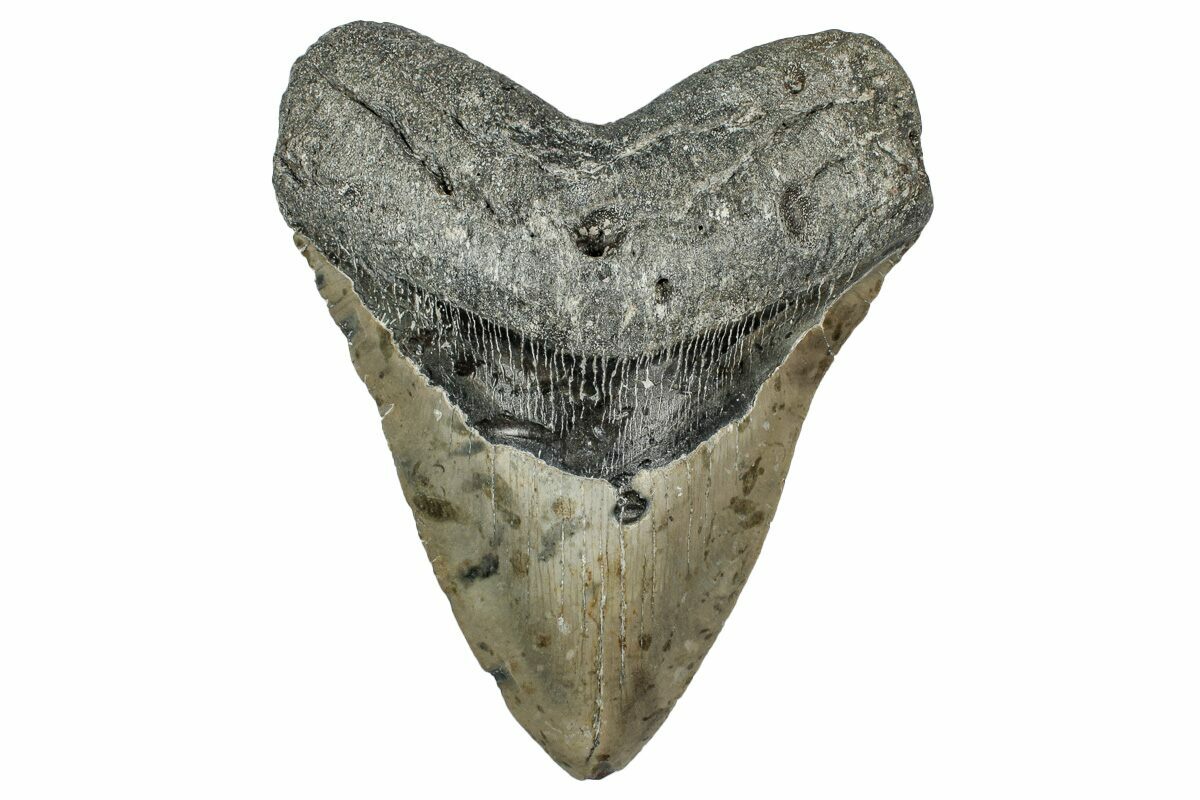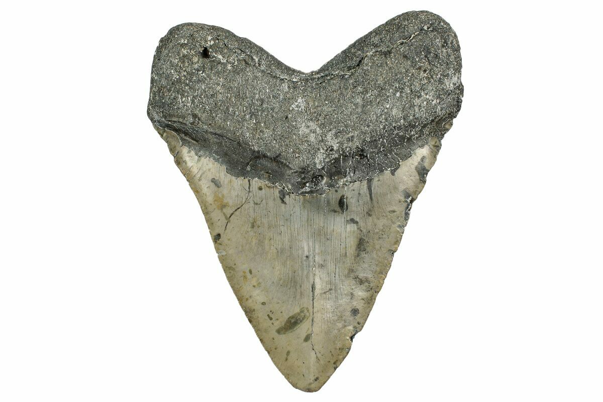 The standard measure for megalodon teeth is slant height, or the longest edge of the tooth. Adult megalodon teeth were typically in the 4 to 5 inch range: teeth over 6 inches are rare and represent super-sized individuals. Only a handful of teeth have ever been found over seven inches.