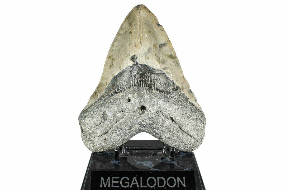 This is a huge 5.86" long megalodon tooth collected on the North Carolina coast. It was found by commercial divers collecting "the ledges" in about 100 feet of water. It would have eroded out of the Pungo River Formation putting its age in the range of 13.8 to 16 million years old. A tooth of this size would have come from a prehistoric mega-shark in the 40 foot size range.