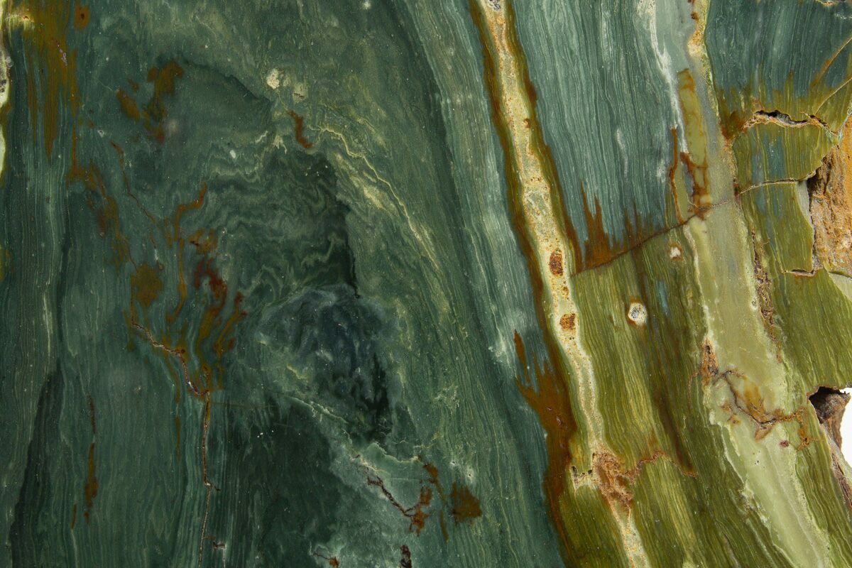 Gary Green Jasper, also referred to as petrified bog wood or Larsonite, is a form of petrified wood from a location near McDermitt, Oregon on the Nevada/Oregon border. It is believed to be wood covered by volcanic activity between 11-15 million years ago. The volcanic event covered this area in debris that deprived the plants of oxygen, halting the decay process. Minerals from the volcanic ash then acted as the replacement material for this petrification/mineralization, giving the wood these vibrant colors.