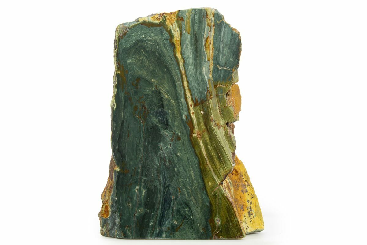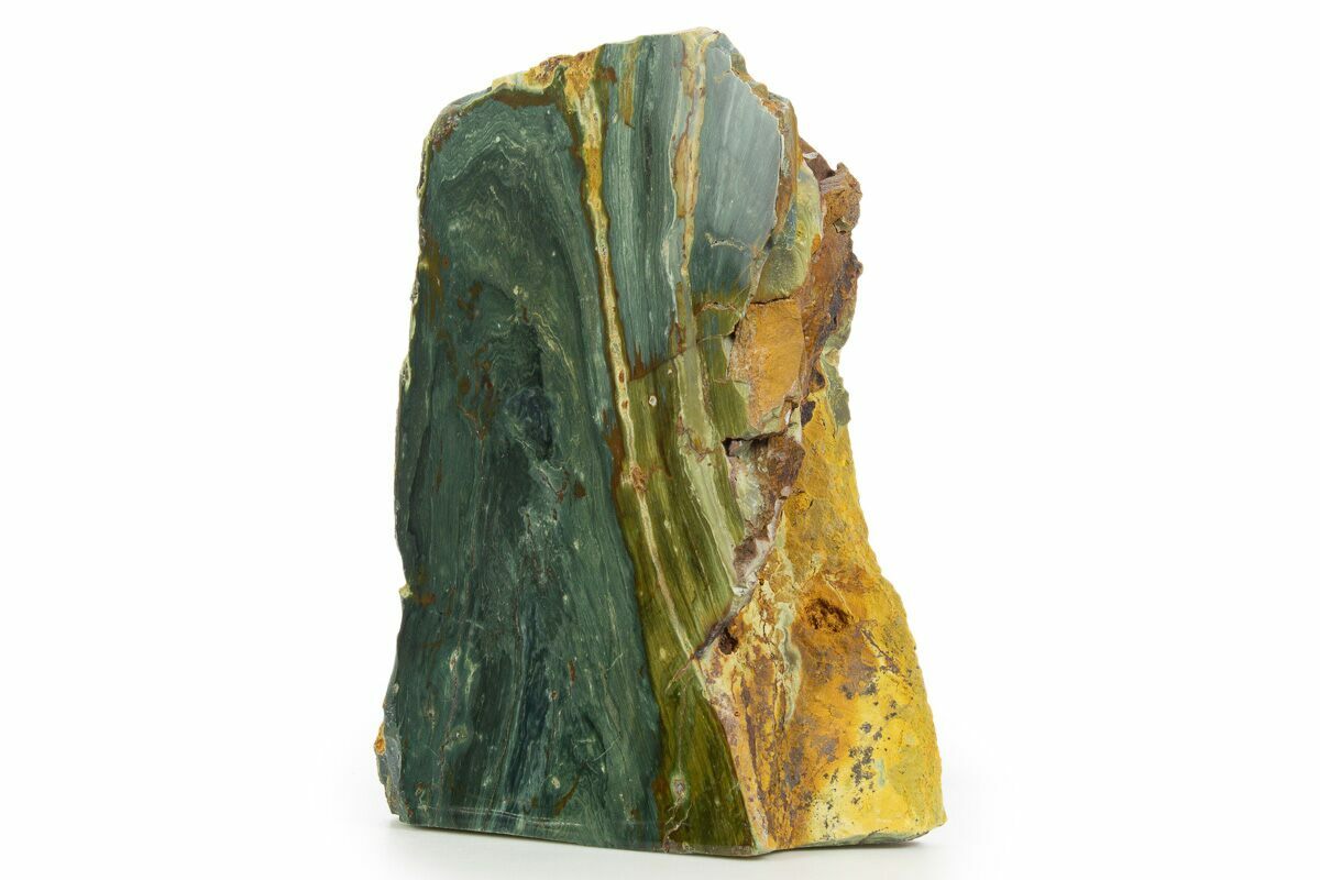This is a 5.9" tall section of jasper replaced petrified wood that was collected near McDermitt, Oregon. This section has been polished to a glossy finish on one side and the base has been cut flat for aesthetic presentation. It has absolutely stunning blue and green coloration.