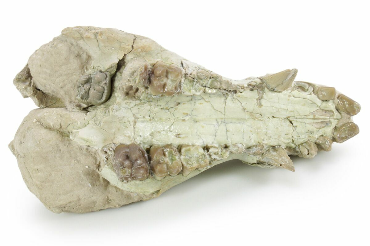 What we have here is an uncommon fossil of the early pig, Perchoerus probus. The specimen features a partial upper skull with several natural teeth, measuring 5.9" long. It was collected from the Brule Formation in South Dakota and would be approximately 30-32 million years old.