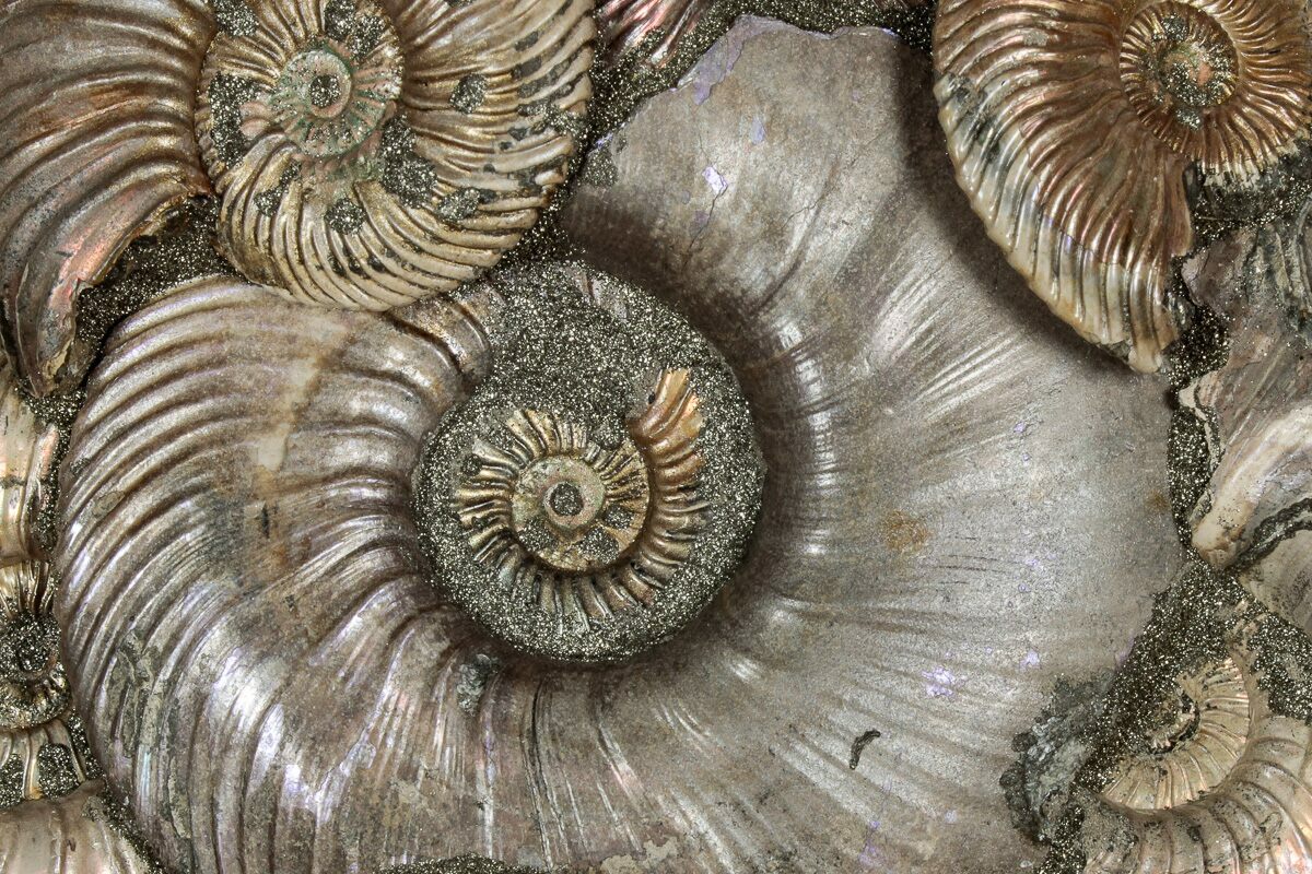 This is an interesting and colorful pyritized ammonite (mostly Quenstedticeras sp.) cluster. The ammonites were collected from the Middle Jurassic aged deposits in Moscow Basin, Russia. The cluster is not natural in the sense that the ammonite fossils have been attached together with pyrite and glue.