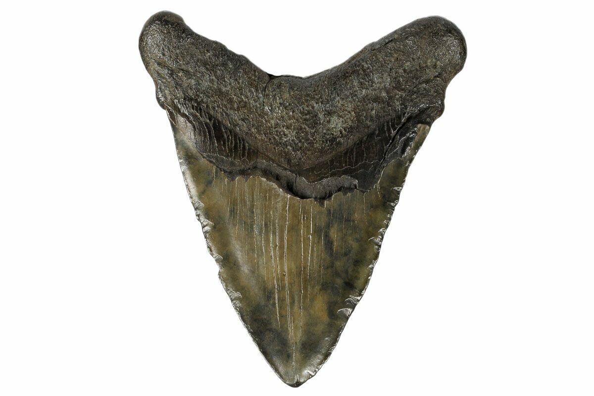 The standard measure for megalodon teeth is slant height, or the longest edge of the tooth. Adult megalodon teeth were typically in the 4 to 5 inch range: teeth over 6 inches are rare and represent super-sized individuals. Only a handful of teeth have ever been found over seven inches.