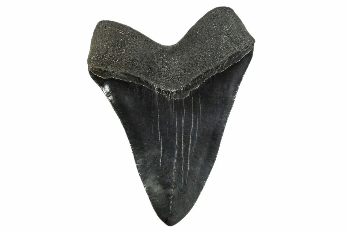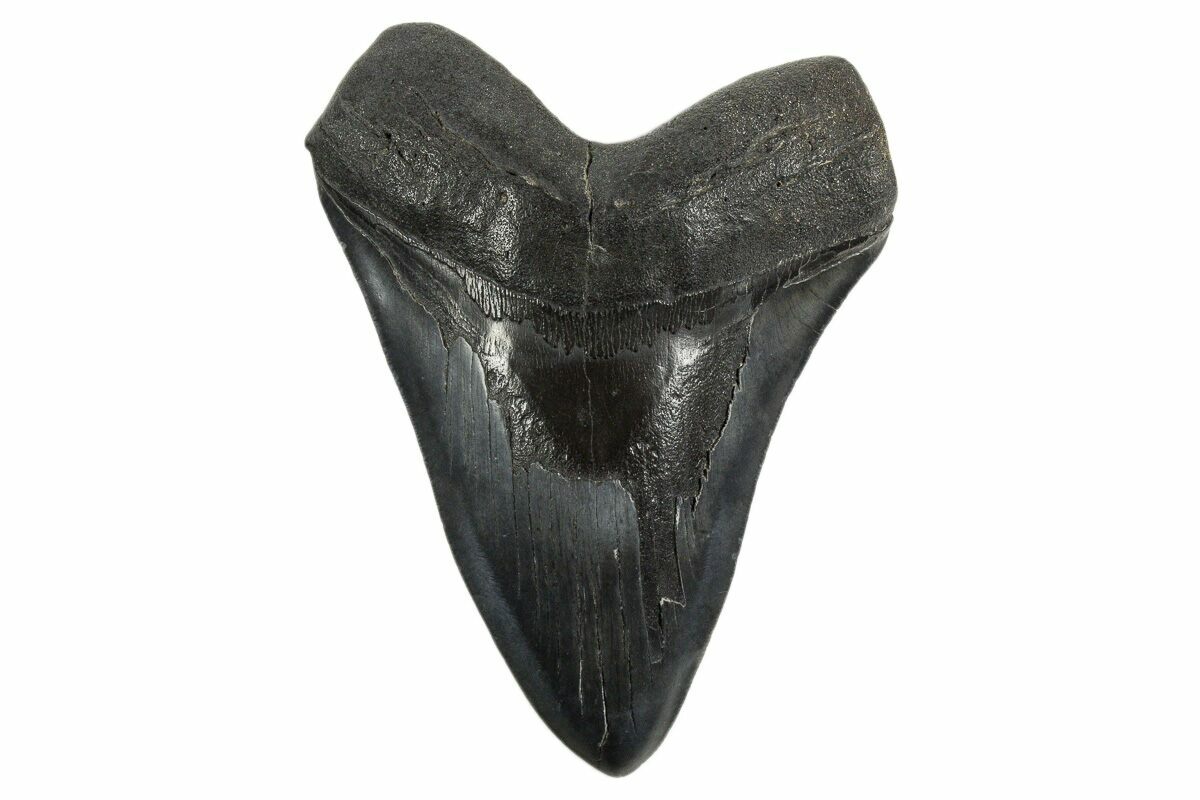 The standard measure for megalodon teeth is slant height, or the longest edge of the tooth. Adult megalodon teeth were typically in the 4 to 5 inch range: teeth over 6 inches are rare and represent super-sized individuals. Only a handful of teeth have ever been found over seven inches.