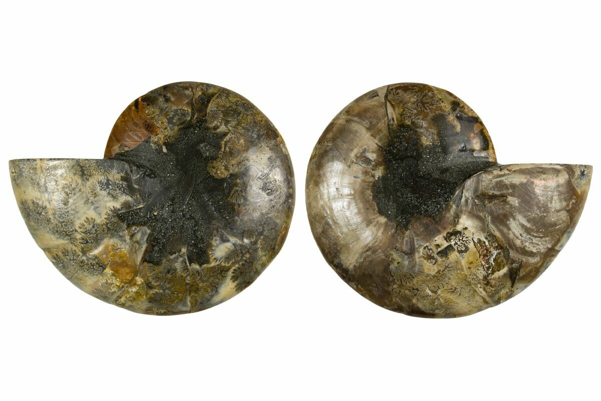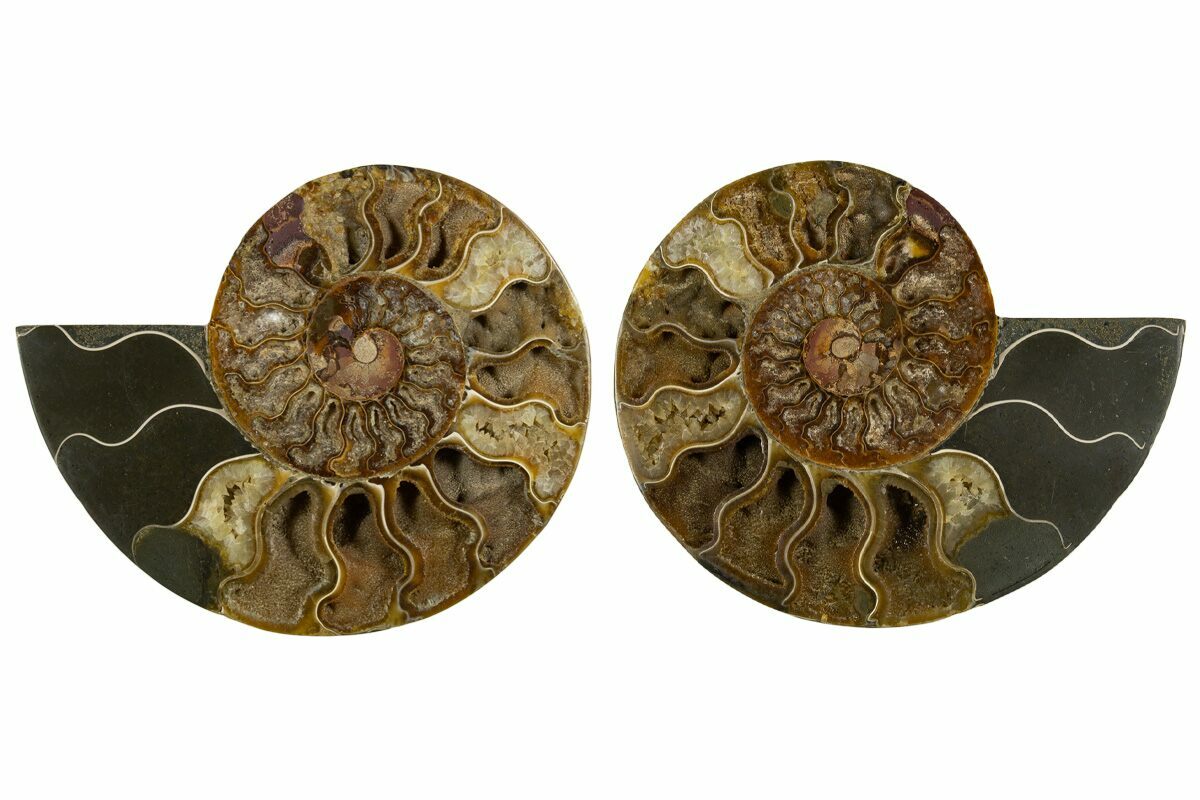 Both halves are included along with a pair of display stands. The center of the ammonite is a composite from another specimen.