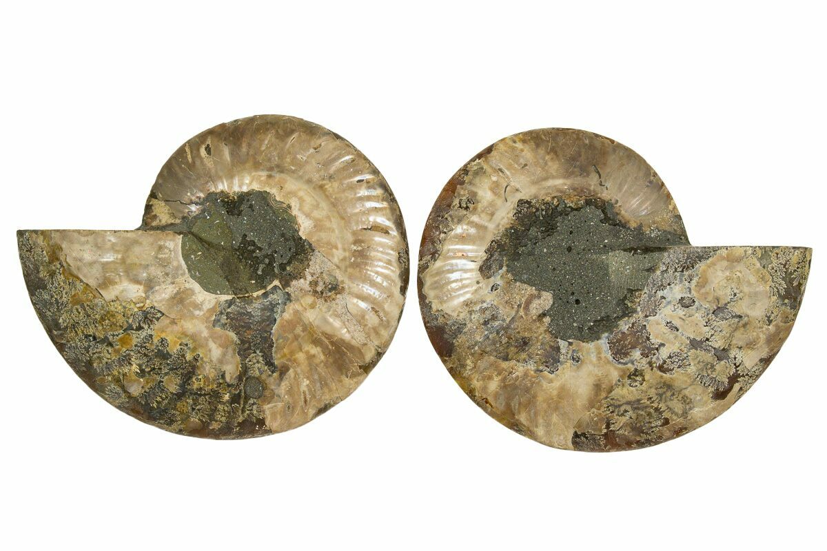 Both halves are included along with a pair of display stands. The center of the ammonite is a composite from another specimen.
