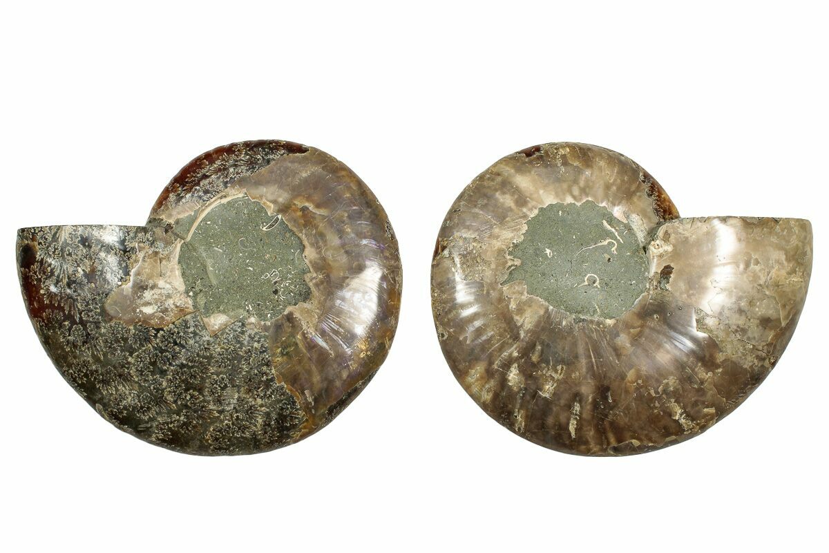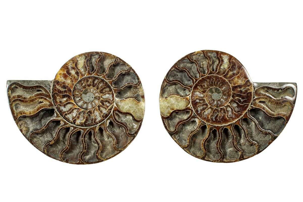It exhibits gorgeous mineralization within the chambers, each separated by white calcite septa (divisions). This highly polished exotic ammonite makes a superb display piece with tremendous historical appeal.