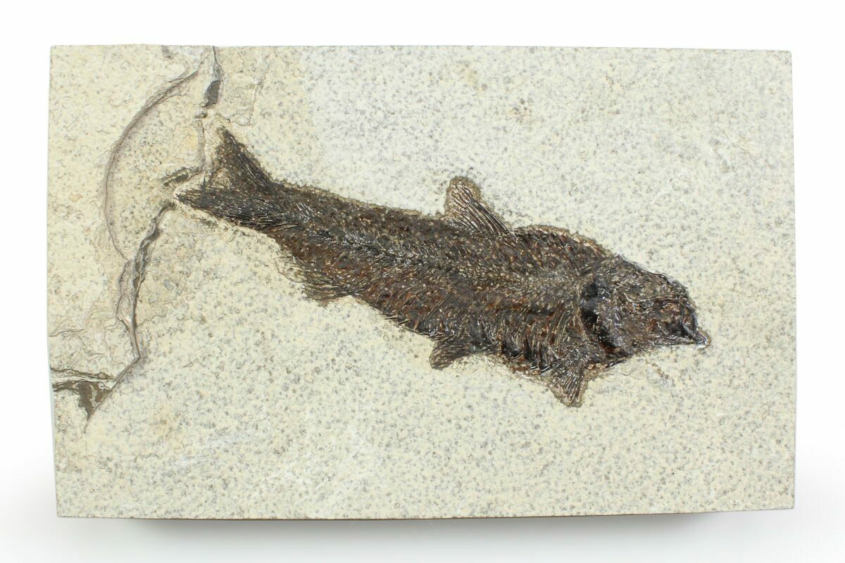 This 5" long Knightia eocaena fossil fish comes from the Eocene-aged Green River Formation of Wyoming. It is well-preserved and expertly prepared, with bone structure, fins, and scale texture clearly visible.