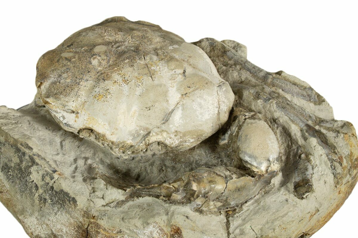 This is a wonderfully prepared example of the Late Eocene aged fossil crab Pulalius vulgaris. These crabs are found within hard concretions (a mass of rock that forms around organic manner) that erode out of the Lincoln Creek Formation, which must be broken open to find the crab. The crab must then be prepared from the hard concretion using mechanical tools, a very time consuming process.