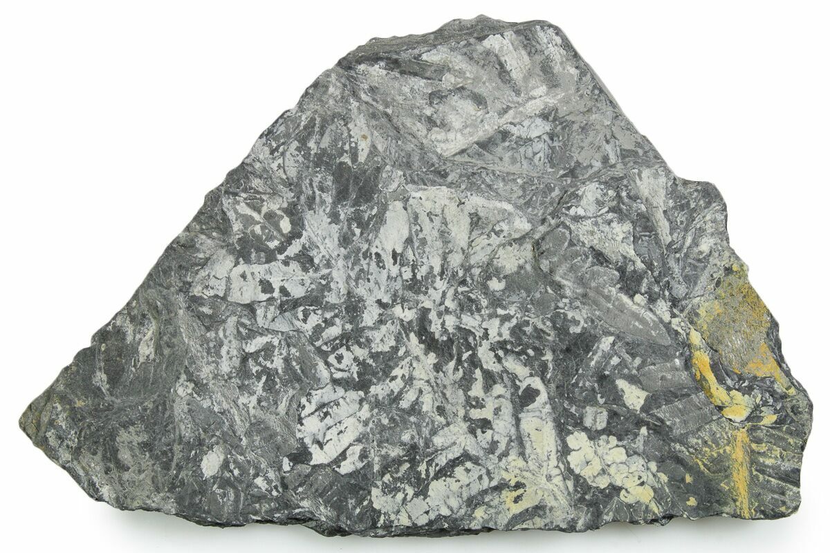 These plants were buried in a swamp where a low temperature, low pressure, and low oxygen environment caused the plant tissue to be slowly replaced by pyrite. This pyrite was later replaced by a whitish mineral (aluminum silicate) as the fossils were buried and exposed to the heat and pressure inside of the earth. The majority of the ferns on this plate are of the genus Alethopteris, though Pecopteris ferns can be seen from time to time.