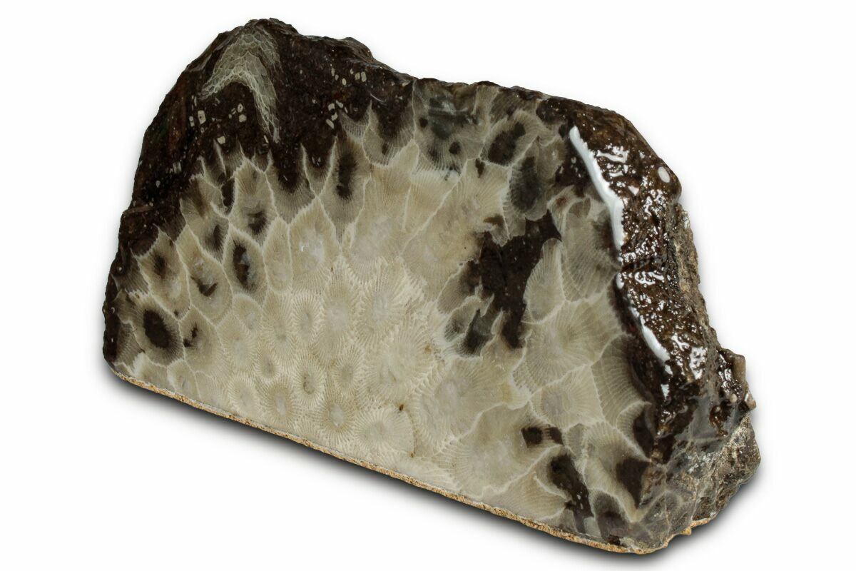 Known locally as Petoskey stones, this fossil coral is commonly found along the shores of Lake Michigan and Lake Huron, as well as in rock quarries stretching from Alpena to Traverse City, Michigan. The material comes from Hexagonaria percarinata, a species of rugose coral that lived during the Middle Devonian, roughly 350 million years ago. Petoskey stones are officially designated as the state stone of Michigan.