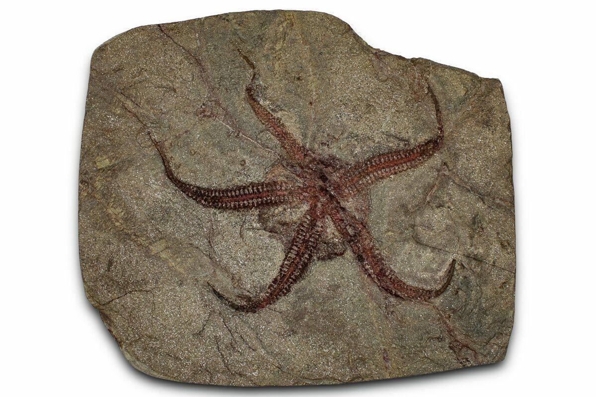 This is a huge, 5.7" wide fossil brittle star (Ophiura sp.) from the Kataoua Formation of Morocco. It is Ordovician in age, approximately 450 million years old. The red/prance coloration is natural and due to the oxidization of iron pyrite.