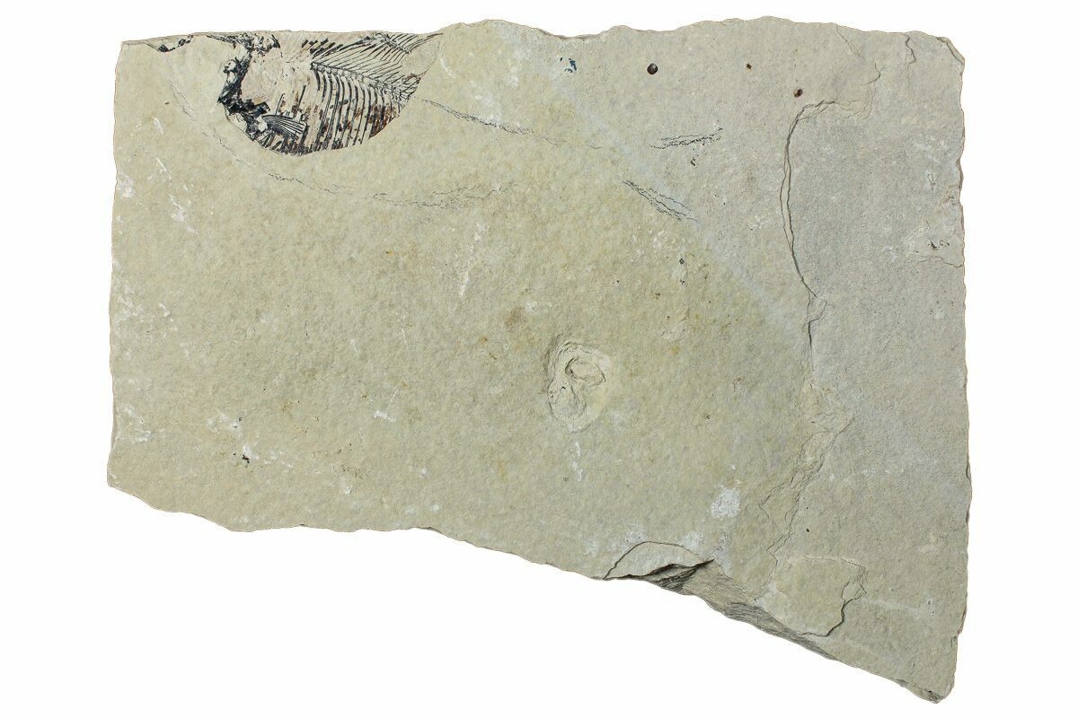 This is a partially exposed fossil fish (Diplomystus dentatus), collected from the Green River Formation near Kemmerer, Wyoming. It appears to be around 5" in length and is on a 7.8 x 6.1" slab of rock. Additional prep work could be done to exposed the rest of the fish. A portion of the head appears to be running off the edge of the rock.
