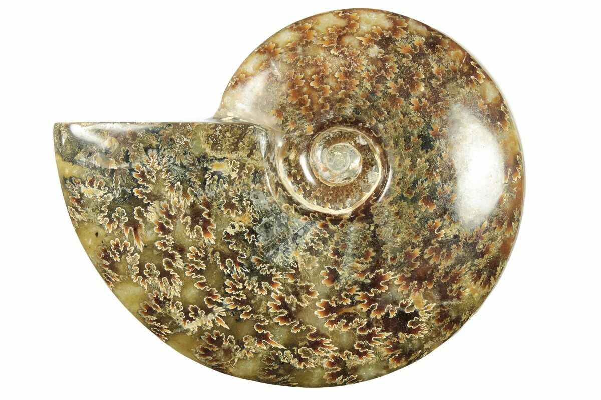 This is a 5" wide polished ammonite from Madagascar of the genus Cleoniceras. It is absolutely gorgeous, displaying a distinctive "oak-leaf" suture pattern on the surface. This 110 million year old ammonite is truly a natural work of art and is very displayable on the included acrylic stand.