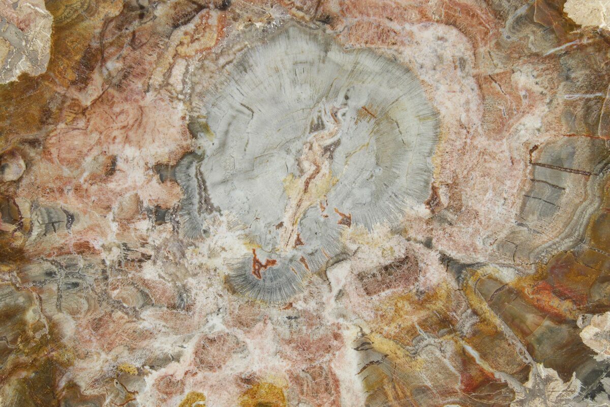 Madagascar petrified wood comes primarily from extensive Triassic-aged deposits in the Mahajanga Basin of northwestern Madagascar, where ancient conifer forests—often attributed to species related to Araucarioxylon—were buried by volcanic ash and floodplain sediments roughly 225–240 million years ago. Over immense spans of time, silica-rich fluids percolated through these sediments, replacing the cellular structure of the wood with chalcedony, jasper, agate, and quartz while preserving growth rings, bark textures, and even microscopic details. The region’s unique geochemistry—especially its iron, manganese, and occasionally copper content—produces the vivid palette Madagascar petrified wood is famous for, including deep brick reds, golden yellows, smoky blacks, and pastel pinks. Many logs are found fully silicified and naturally fractured into large, rounded segments that local artisans cut into slabs, spheres, eggs, and freeforms. These deposits stretch across arid badlands where erosion steadily exposes new material, making Madagascar one of the world’s premier sources of highly colorful, beautifully patterned fossil wood.
