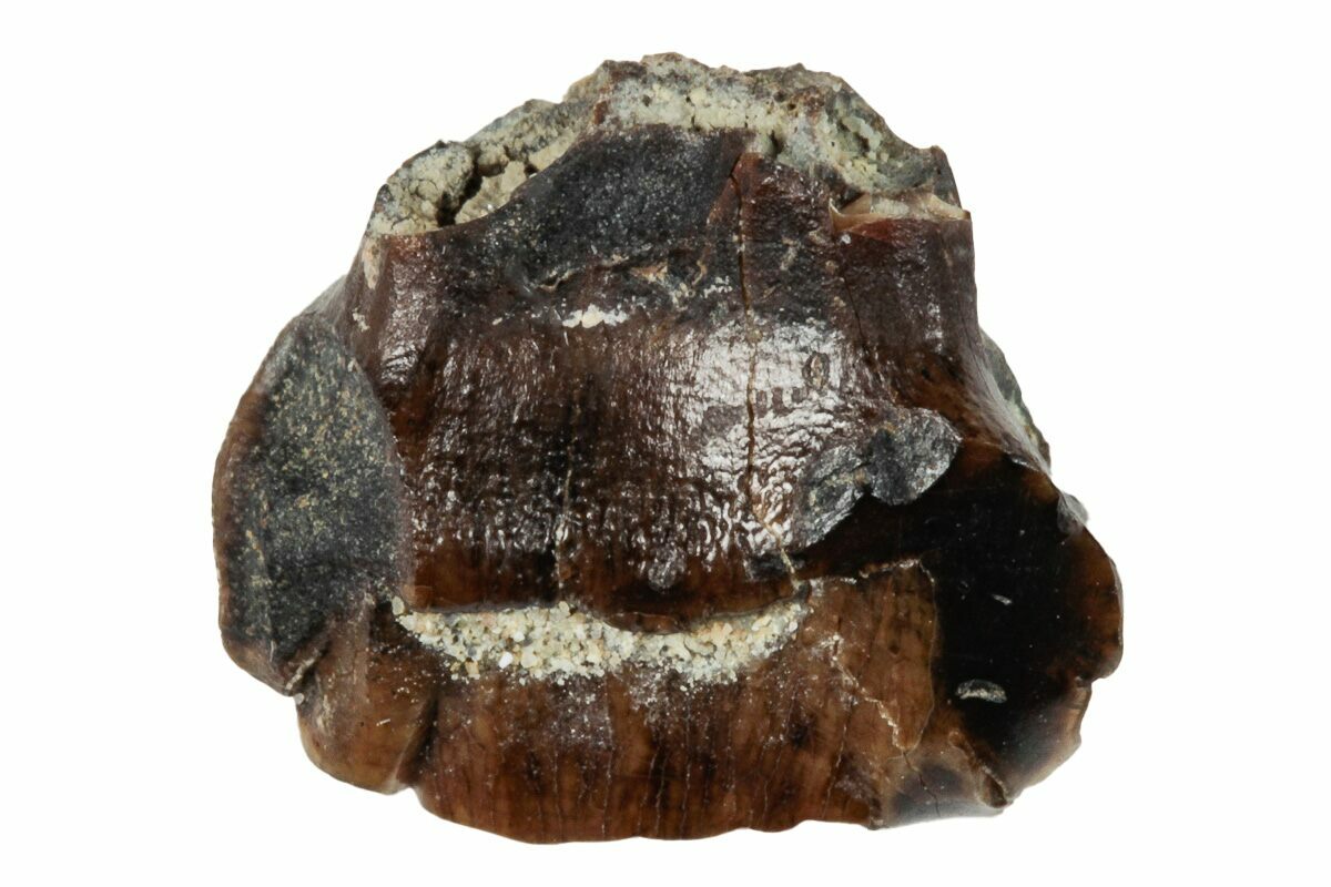 This is a .50" wide tooth from a nodosaur. While nodosaur teeth are relatively abundant in the formation, not enough skeletal material has been recovered to describe the species. The preservation of this tooth is fairly nice considering most of these teeth come out of the ground heavily worn/weathered.
