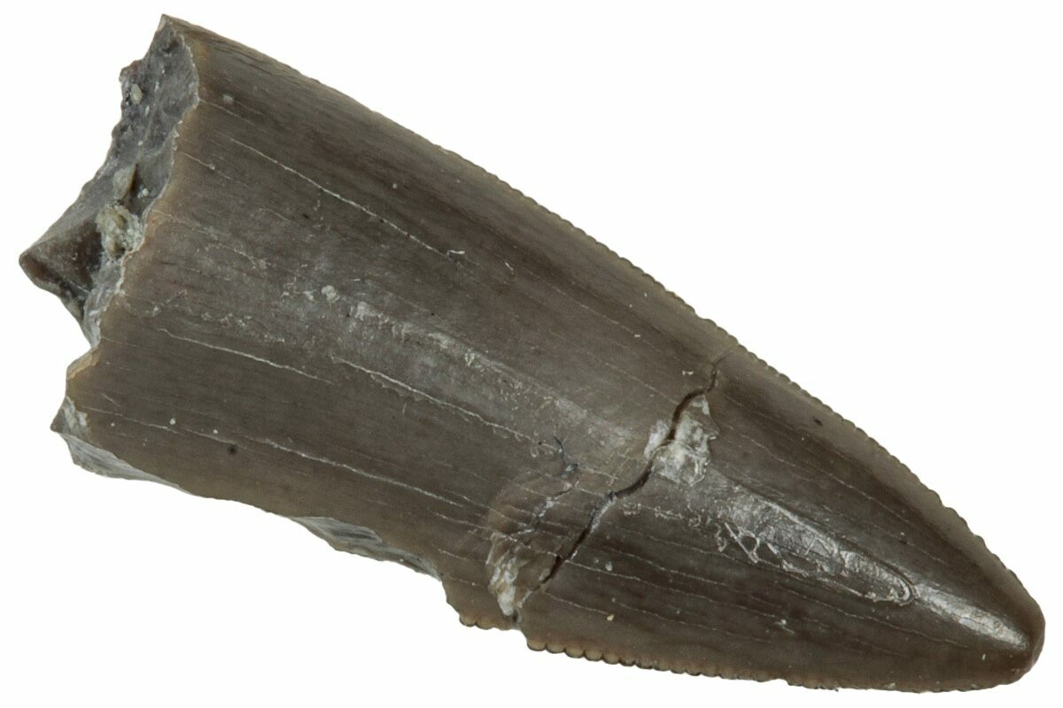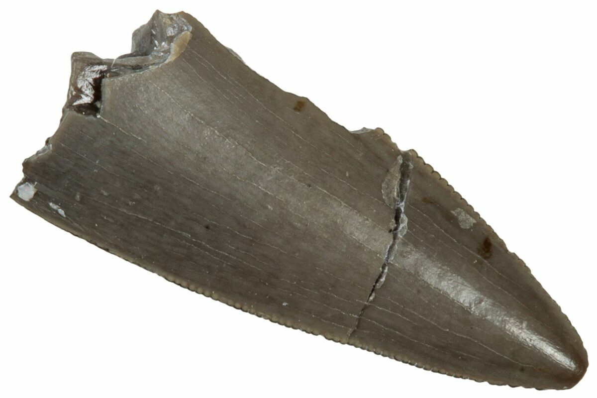 This is a .50" long, serrated, Triassic reptile (Postosuchus?) tooth from the Chinle Formation of Arizona. It has beautiful black-grey preservation and fine serrations.