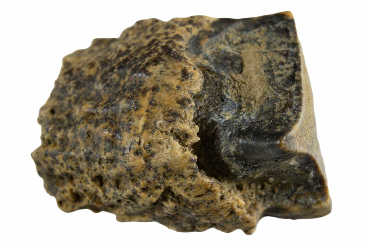 This specimen is one of those naturally shed teeth and features a polished chewing surface, showing clear evidence of the wear that came from processing vegetation millions of years ago.