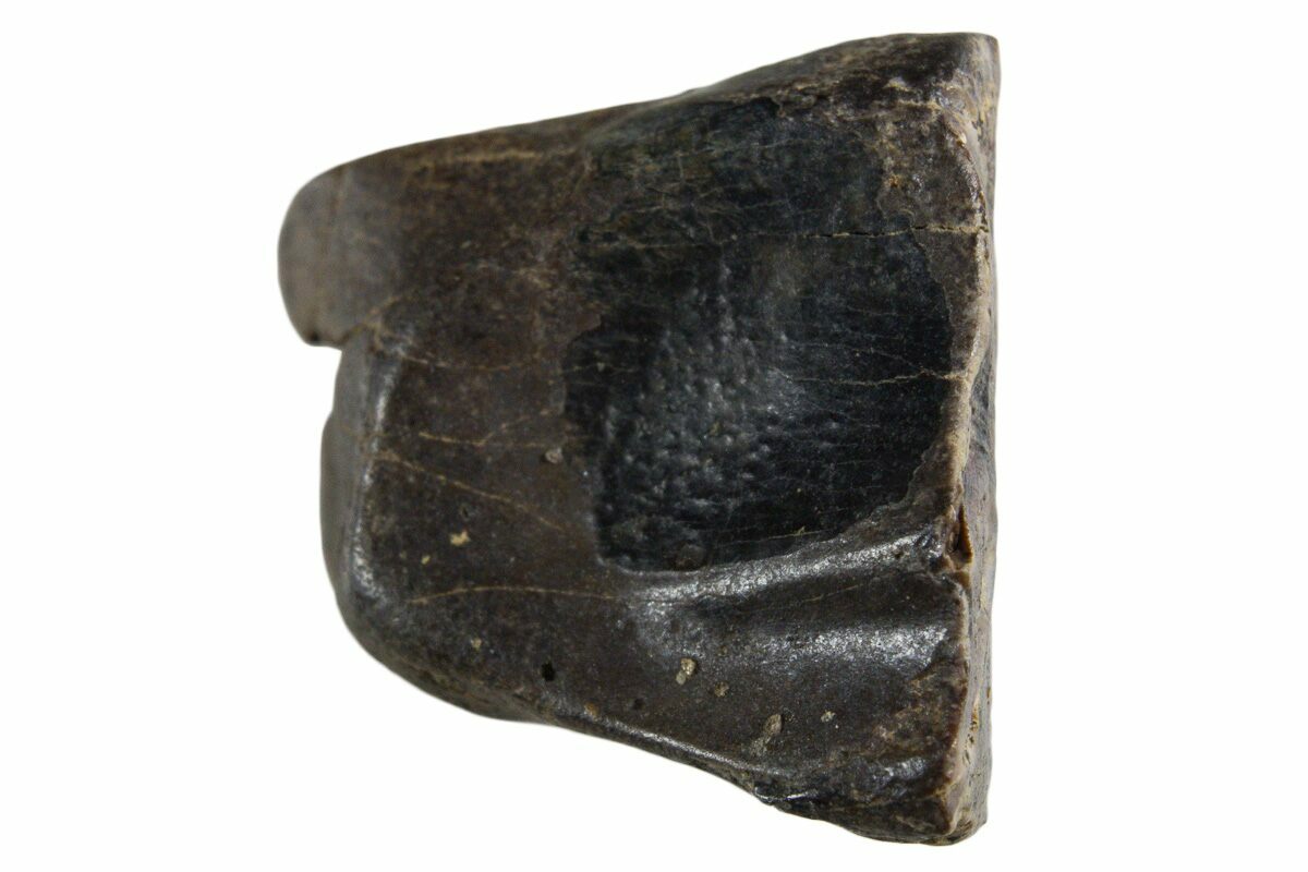 This specimen is one of those naturally shed teeth and features a polished chewing surface, showing clear evidence of the wear that came from processing vegetation millions of years ago.