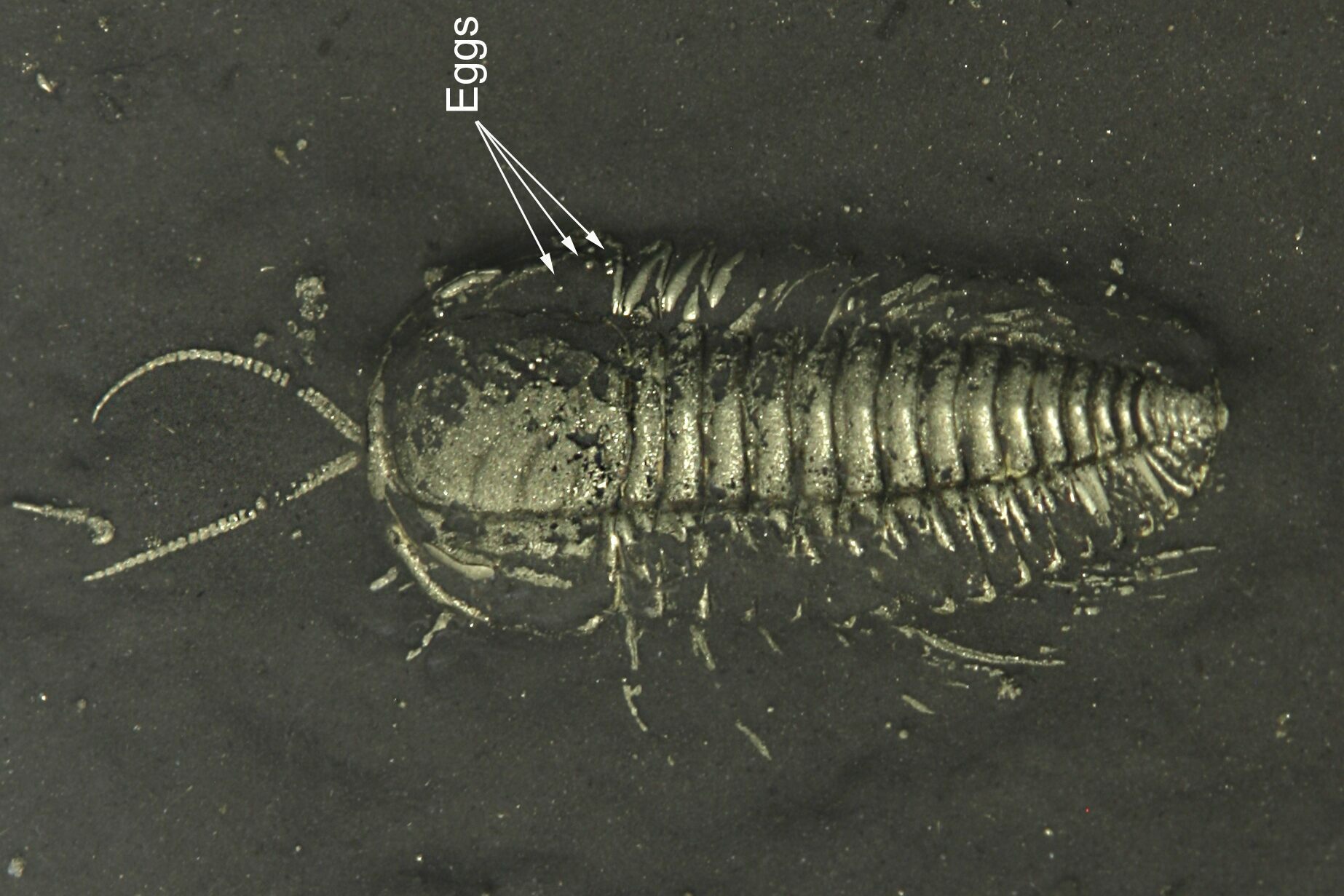 Trilobites from a single layer of the a quarry in the Whetstone Gulf Formation of New York, were found to have associated eggs still in place. The eggs are spherical to elliptical in shape, about 200 µm in size, and are clustered in the genal area of the cephalon. The location of the eggs is consistent with where modern female horseshoe crabs release their unfertilized eggs.