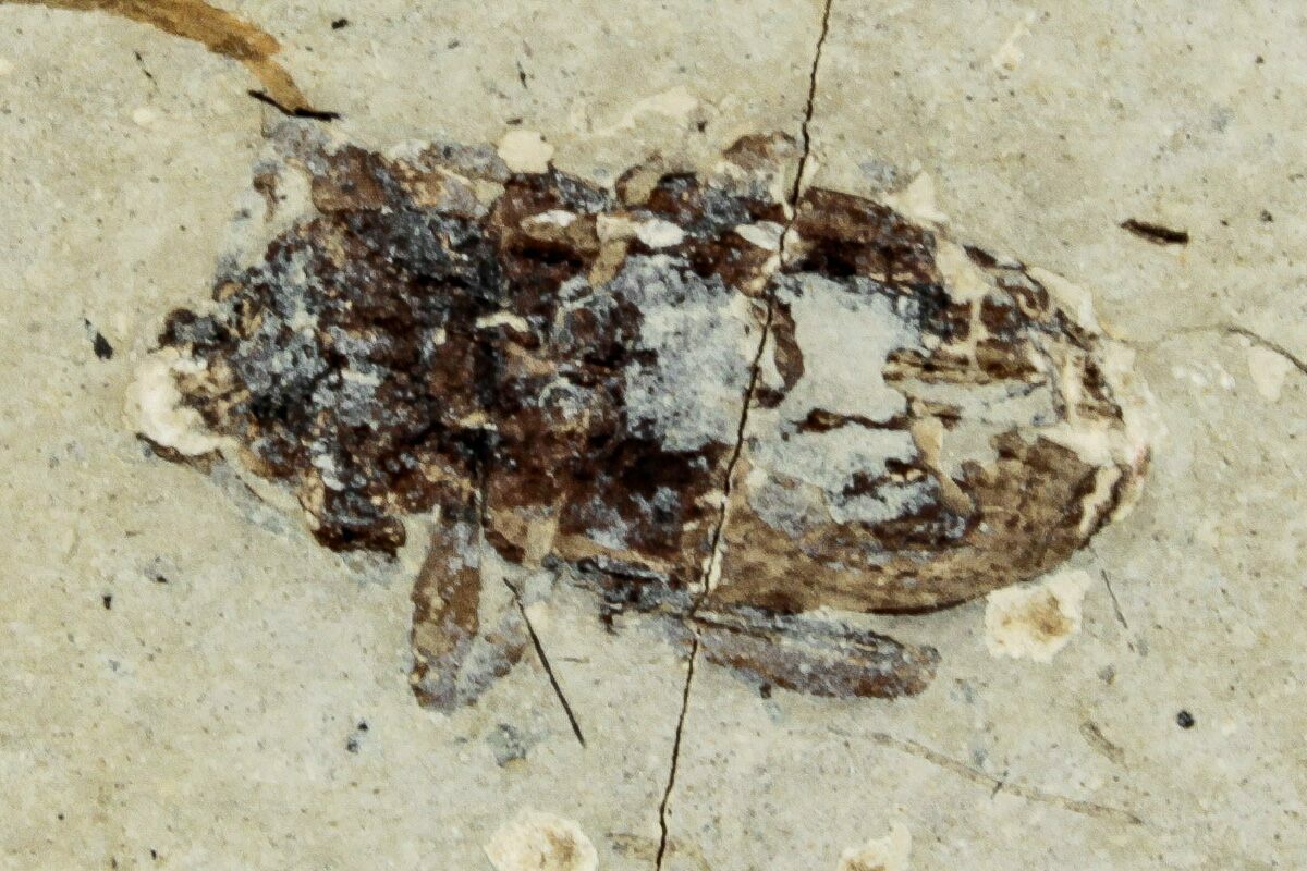 This is a fossil true weevil (order Coleoptera, family Curculionidae), collected from an Oligocene-aged shale deposit near Cereste in Southern France. The weevil measures .54" wide and is beautifully detailed.