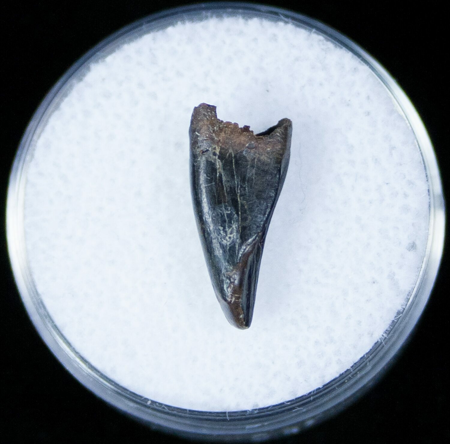 This is a .57" long Tyrannosaurid tooth which would typically labeled by collectors as Aublysodon. There is debate about whether this is actually a valid genus or rather juvenile teeth of another type of Tyrannosaurid. This is due to the fact that Aublysodon was described based on only partial skull elements and several teeth in 1868, from the older Judith River Formation. This uniquely shaped tooth matches the description of these teeth but until more skeletal material is found of this dinosaur the jury is still out to it's true classification.