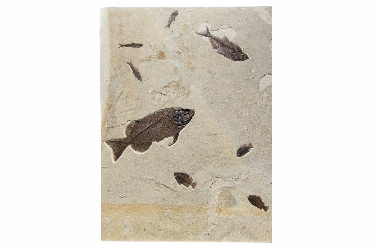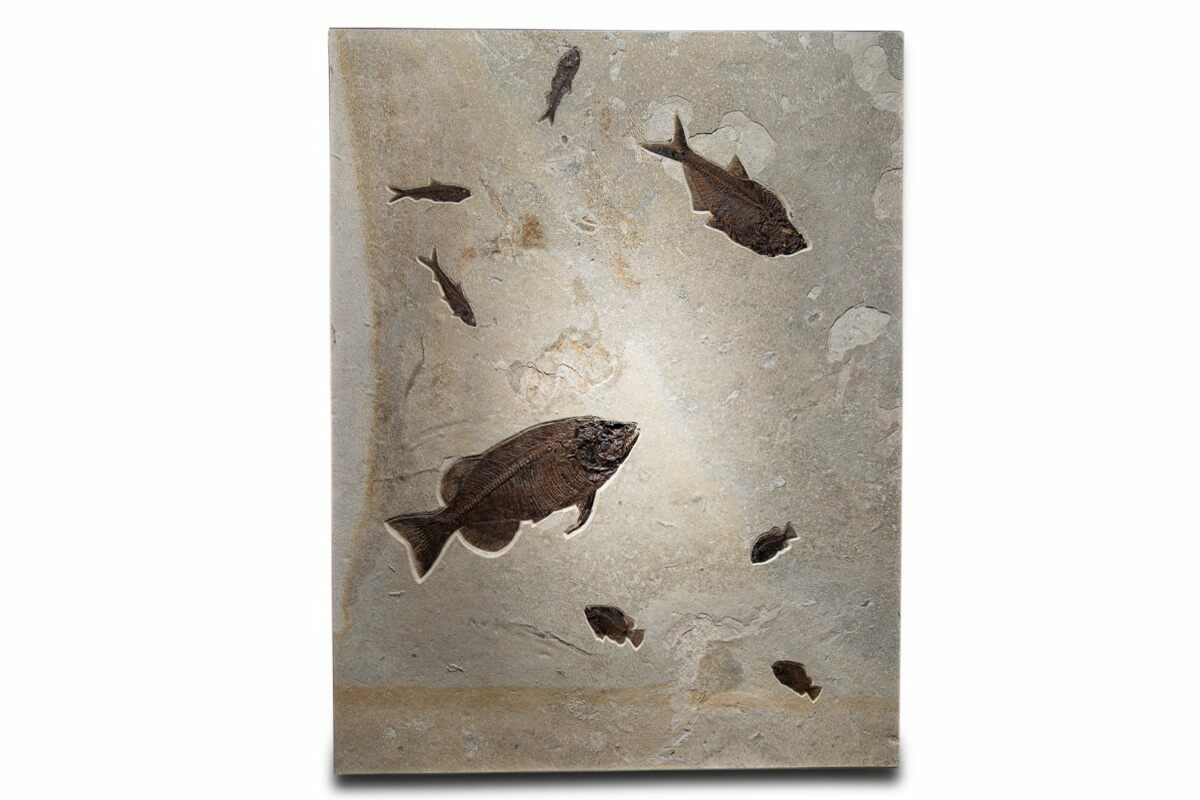 At its heart is an impressive 20.4" long Phareodus, a seldom-seen predator. Surrounding it are three elegant Knightia eocaena, a large Diplomystus dentatus, and three spiny Cockerellites (Priscacara) liops. This fossil mural is a true window into an ancient lake teeming with life nearly 50 million years ago.