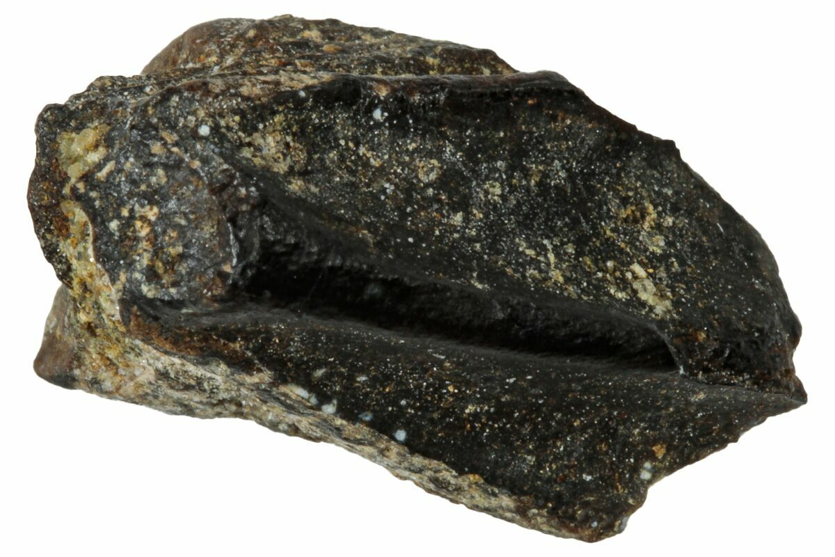 This is a .59" tooth from a hadrosaur (Edmontosaurus annectens), collected from the Lance (Creek) Formation of Wyoming.
